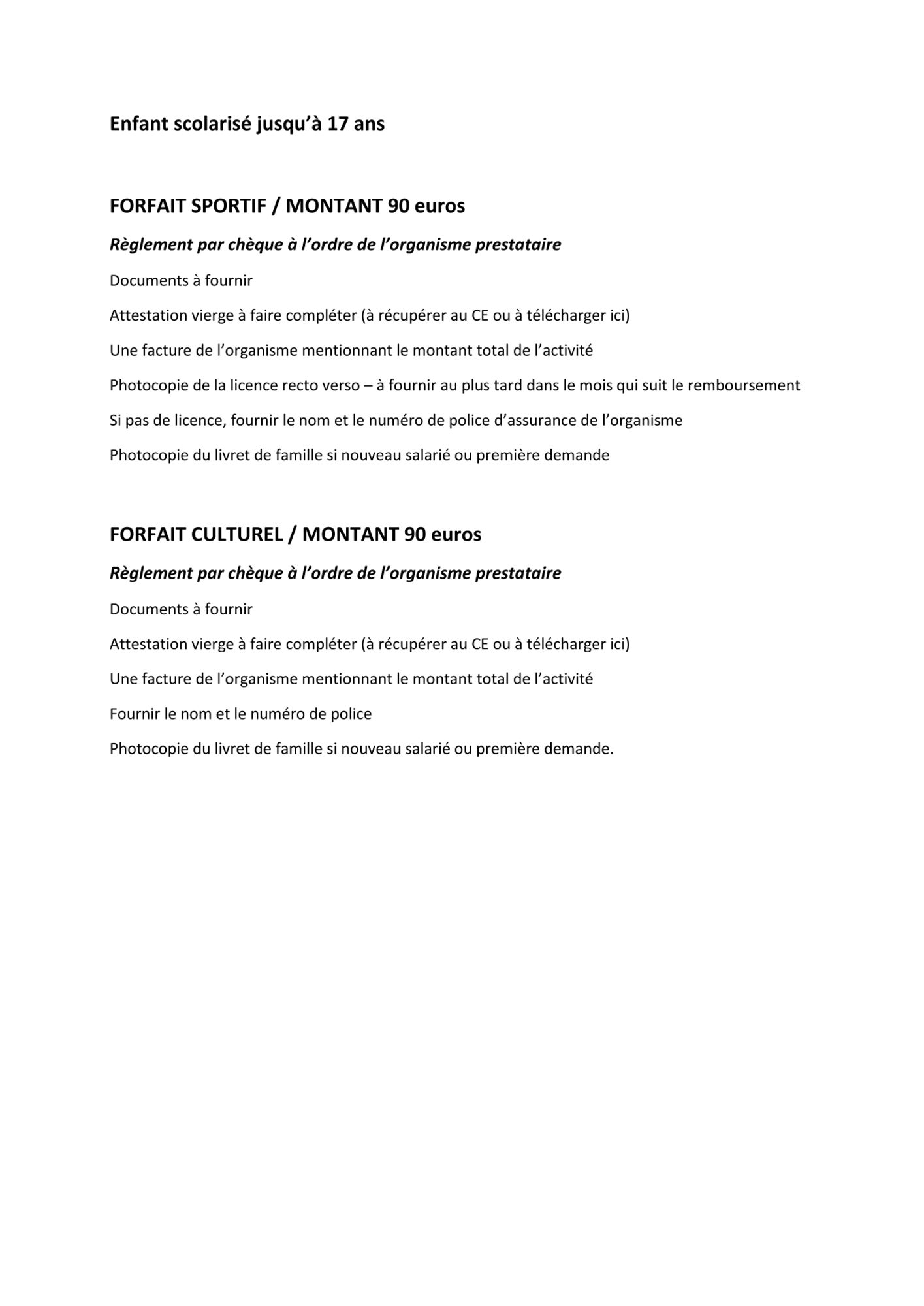 Forfaits sport – culturel (90€ par année civile et par enfant)