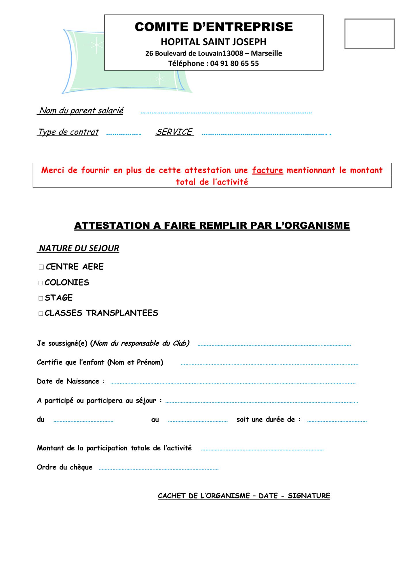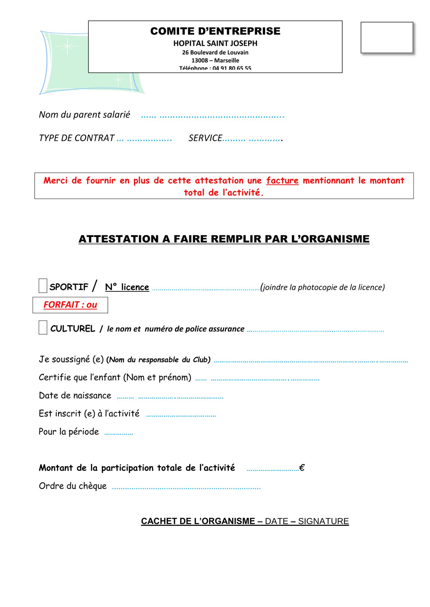 - L’ATTESTATION DU CSE A FAIRE REMPLIR PAR L’ORGANISME