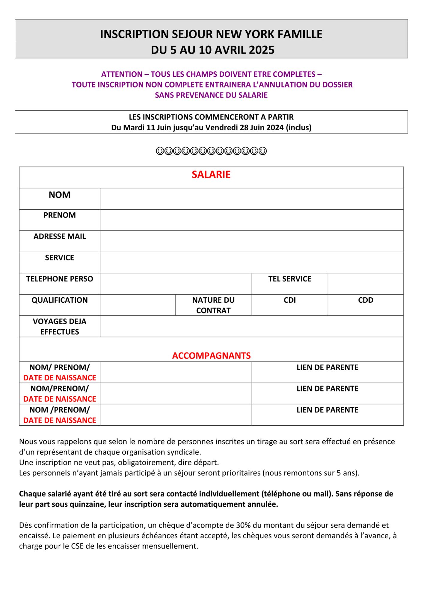 Les fiches d'inscription dans les notes (voir colonne de droite) sont à remplir (écriture lisible) et à faire parvenir au CSE.