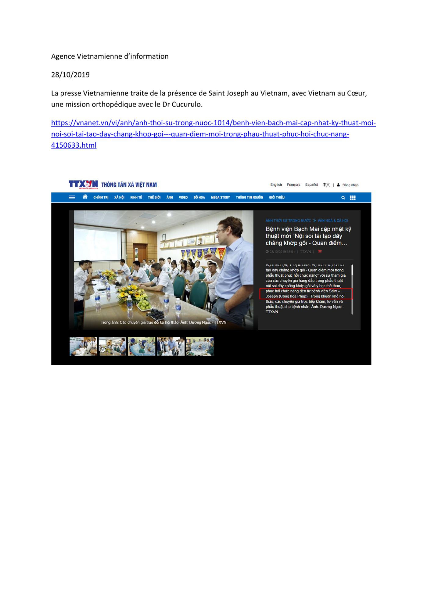 Agence Vietnamienne d'information, 28/10/2019 : La presse Vietnamienne traite de la présence de Saint Joseph au Vietnam, avec Vietnam au Coeur, une mission orthopédique avec le Dr Cucurulo L'article original Agence Vietnamienne d'information, 28/10/2019 : La presse Vietnamienne traite de la présence de Saint Joseph au Vietnam, avec Vietnam au Coeur, une mission orthopédique avec le Dr Cucurulo (970.4 Ko)