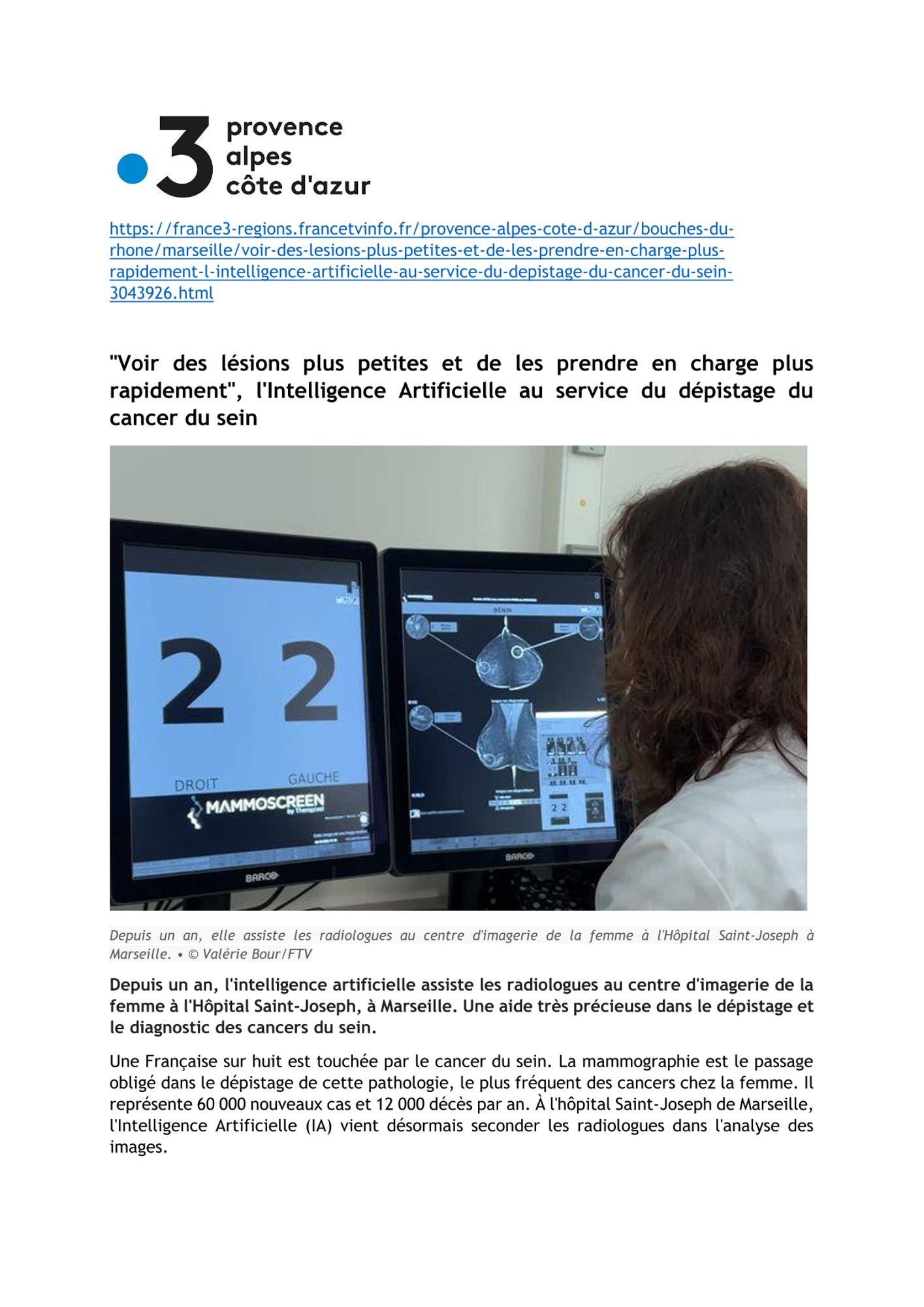 France info TV, 13/10/2024 : "Voir des lésions plus petites et de les prendre en charge plus rapidement", l'Intelligence Artificielle au service du dépistage du cancer du sein France info TV, 13/10/2024 : "Voir des lésions plus petites et de les prendre en charge plus rapidement", l'Intelligence Artificielle au service du dépistage du cancer du sein (182.8 Ko)