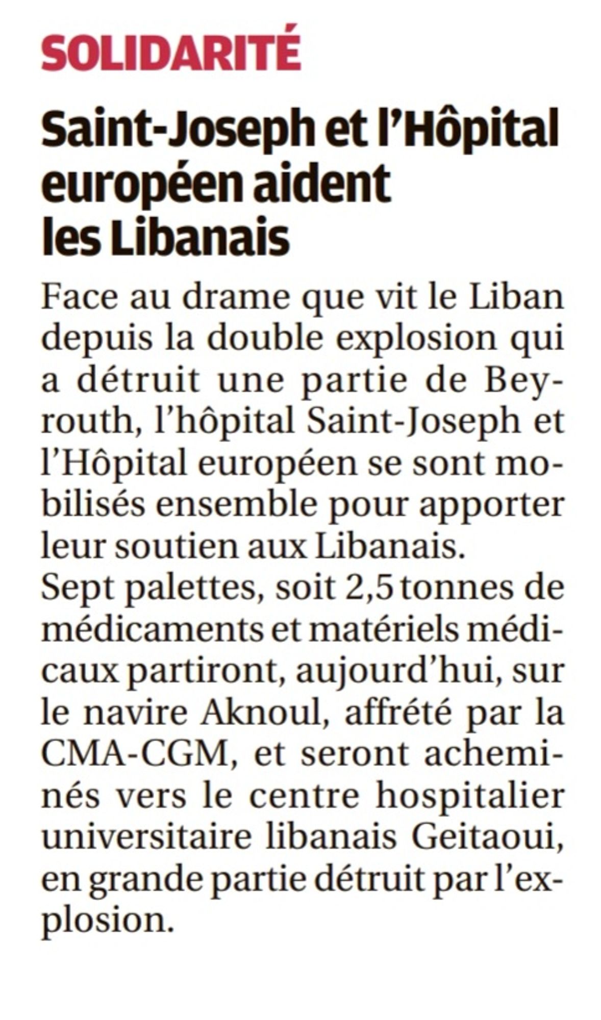 Saint Joseph et l'Hôpital Européen aident les Libanais La Provence, 21/08/2020 La Provence, 21/08/2020 : Saint Joseph et l'Hôpital Européen aident les Libanais (161.5 Ko)