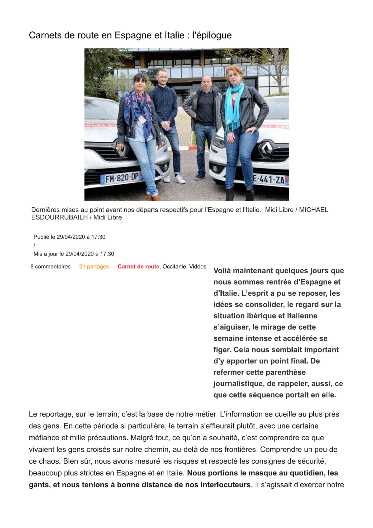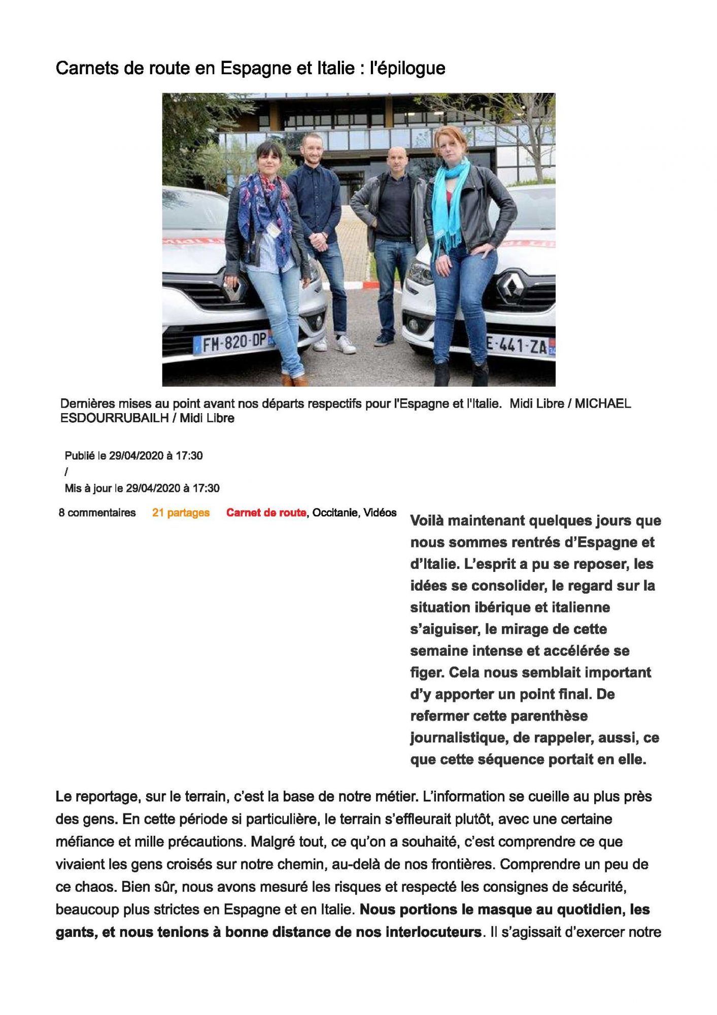 Carnet de route en Espagne et Italie : l'épilogue MidiLIbre.fr, 29/04/2020 MidiLIbre.fr, 29/04/2020 : Carnet de route en Espagne et Italie : l'épilogue (722.2 Ko)