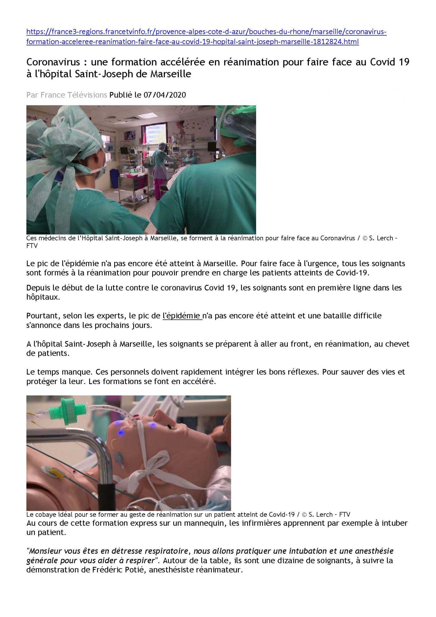 Coronavirus : une formation accélérée en réanimation pour faire face au Covid 19 à l'Hôpital Saint Joseph de Marseille France 3 PACA, 07/04/2020 France 3 PACA, 07/04/2020 : Coronavirus : une formation accélérée en réanimation pour faire face au Covid 19 à l'Hôpital Saint Joseph de Marseille (199.4 Ko)