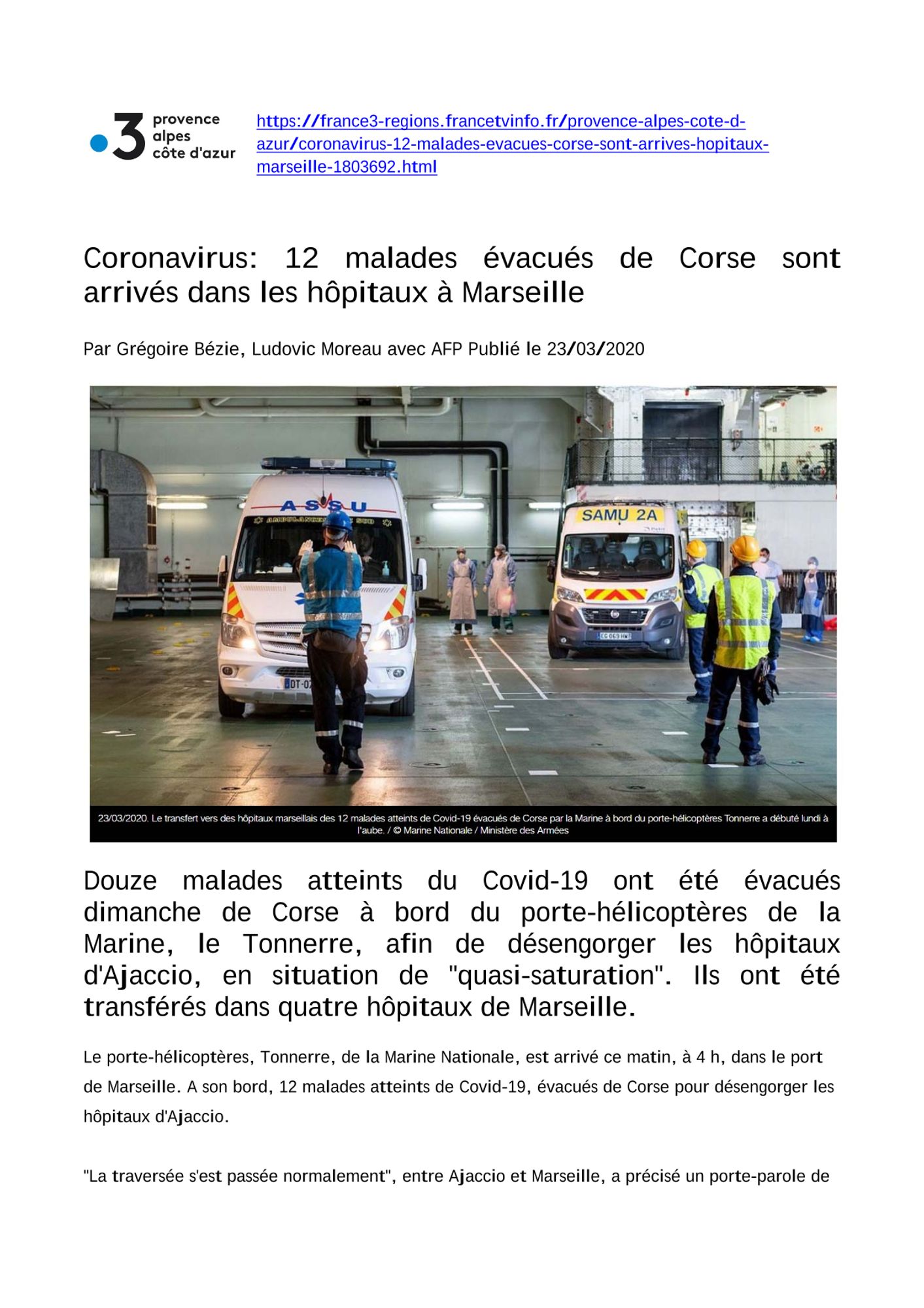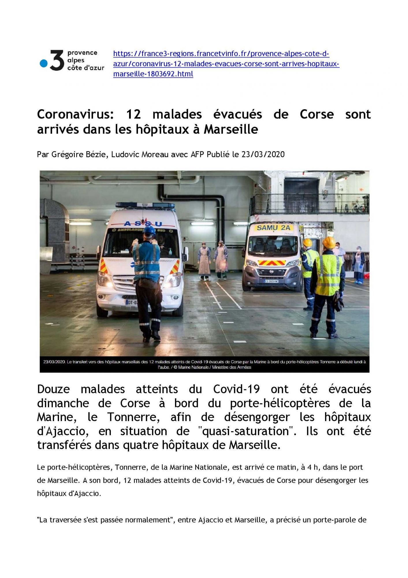 Coronavirus : 12 malades évacués de Corse sont arrivés dans les hôpitaux à Marseille France 3 PACA, 23/03/2020 France 3 PACA, 23/03/2020 : Coronavirus : 12 malades évacués de Corse sont arrivés dans les hôpitaux à Marseille (320.9 Ko)