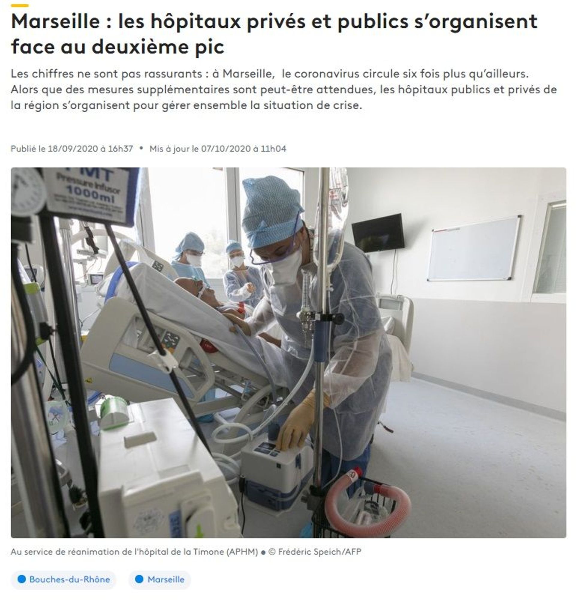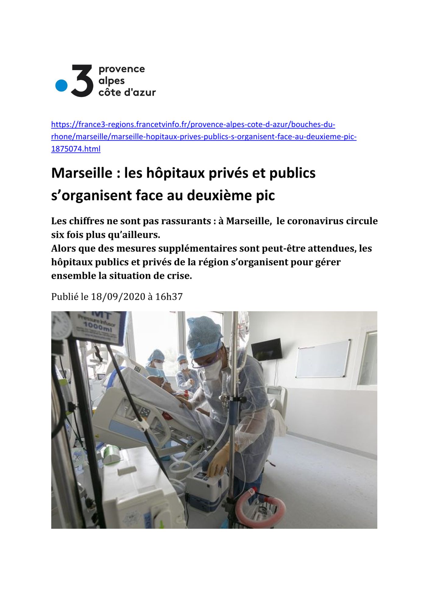 Marseille : les hôpitaux privés et publics s'organisent face au deuxième pic France3 PACA, 18/09/2020 Pour lire l'article en ligne France 3 PACA, 18/09/2020 : Marseille : les hôpitaux privés et publics s'organisent face au deuxième pic (798.4 Ko)