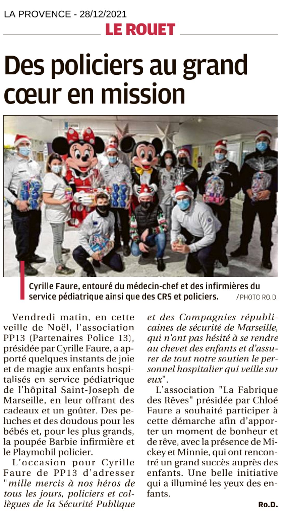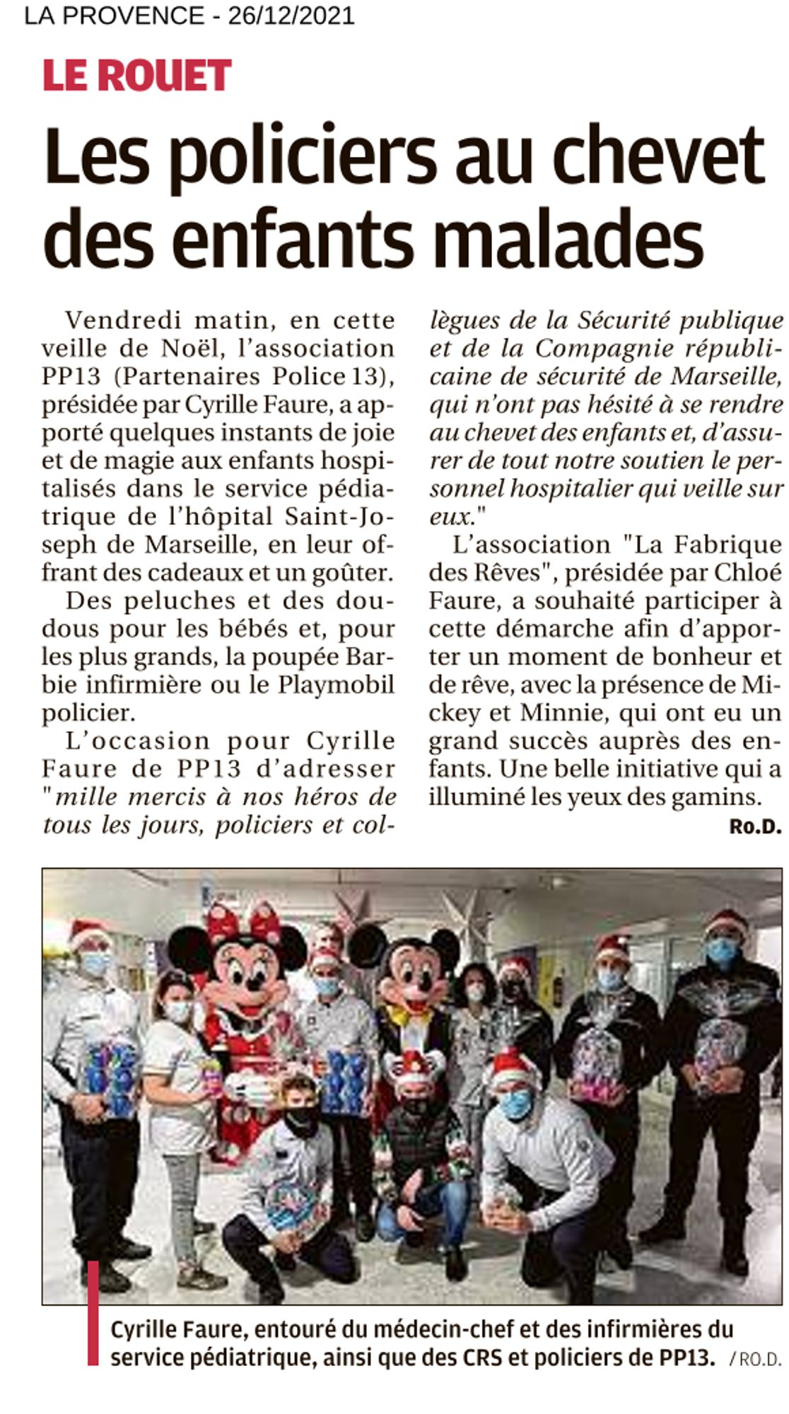 Association PP13 (Partenaires Police 13) en Pédiatrie pour Noël La Provence, 26 & 28/12/2021 La Provence, 26/12/2021 : Les policiers au chevet des enfants malades (363.8 Ko) La Provence, 28/12/2021 : Des policiers au grand cur en mission (662.1 Ko)