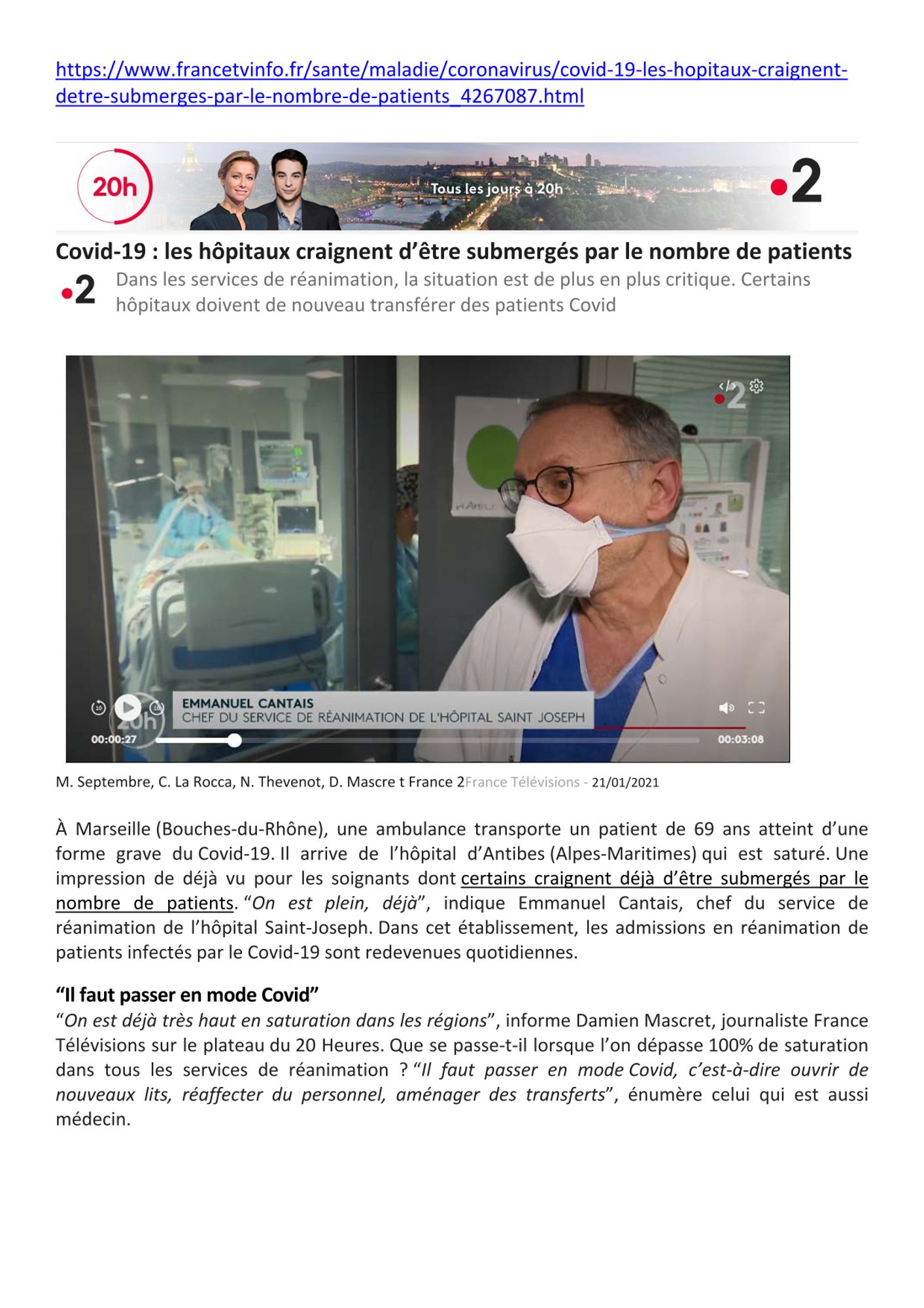Covid-19 : les hôpitaux craignent d'être submergés par le nombre de patient France 2, journal de 20h, 21/01/2021 Pour visionner le reportage Covid-19 : les hôpitaux craignent d'être submergés par le nombre de patient (188.8 Ko)