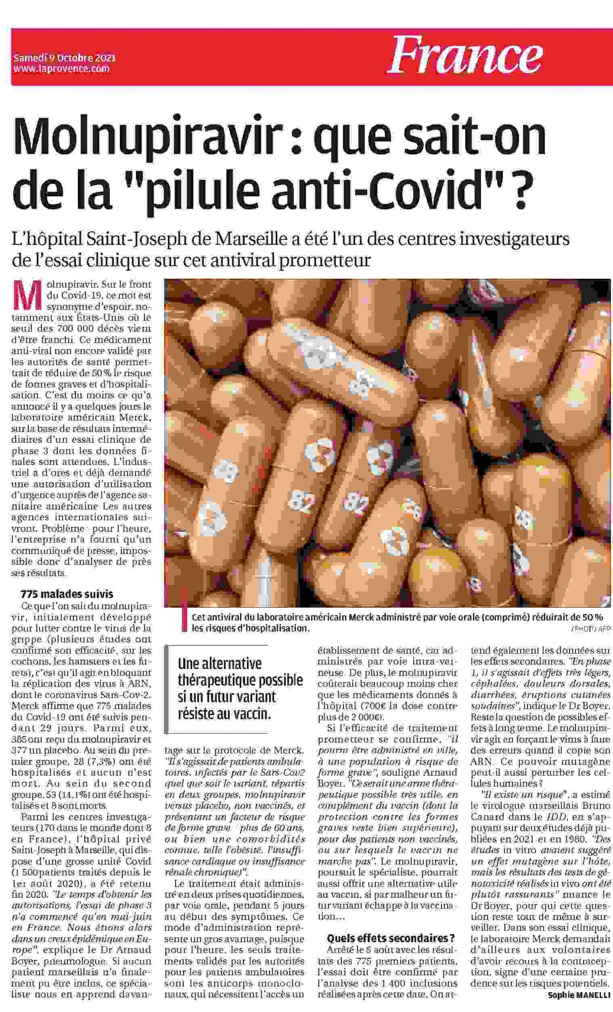 Molnupiravir : que sait-on de la "pilule anti-Covid" ? La Provence, 09/10/2021 La Provence, 09/10/2021 : Molnupiravir : que sait-on de la "pilule anti-Covid" ? (783.1 Ko)