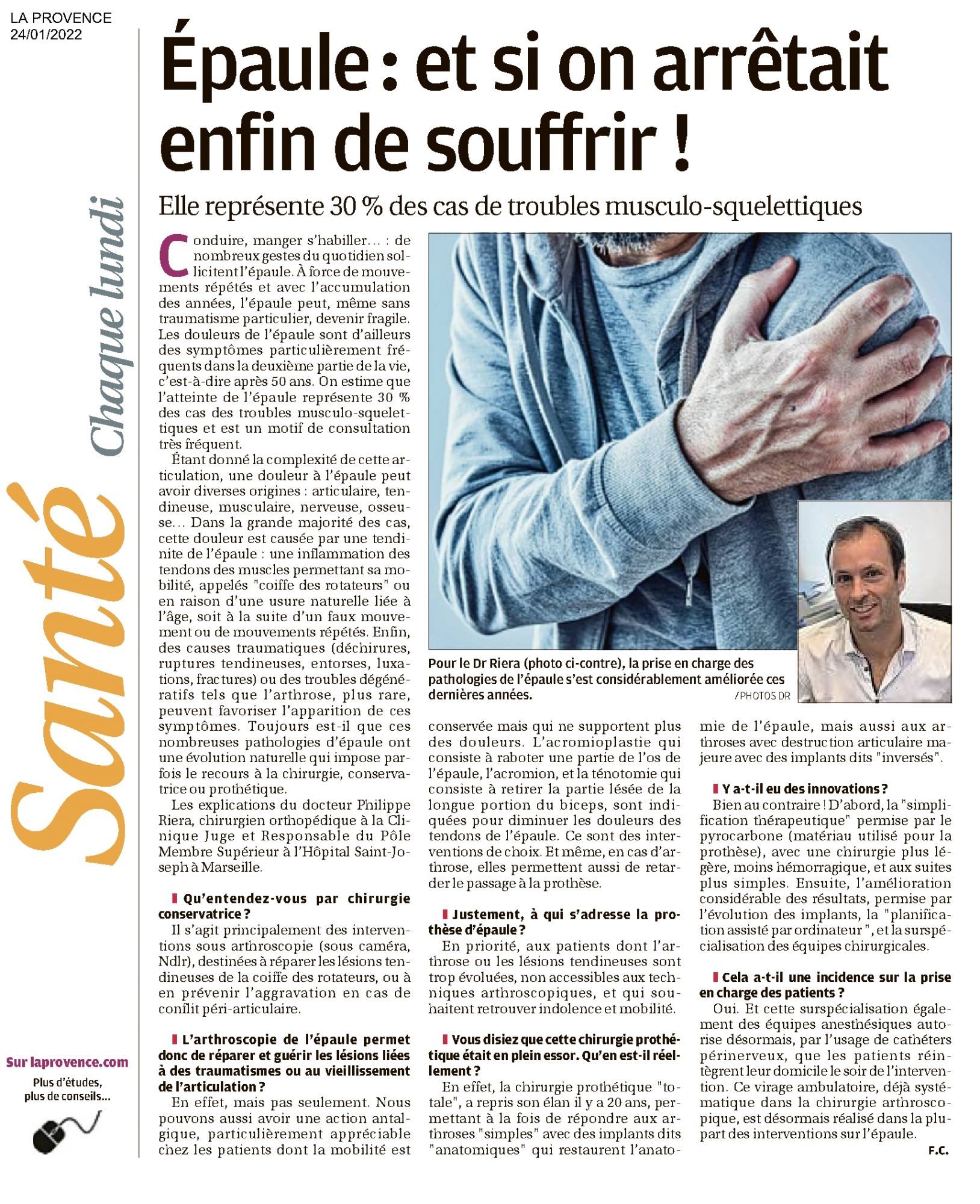 Epaule : et si on arrêtait enfin de souffrir ! La Provence, 24/01/2022 La Provence, 24/01/2022 : Epaule : et si on arrêtait enfin de souffrir ! (332.7 Ko)