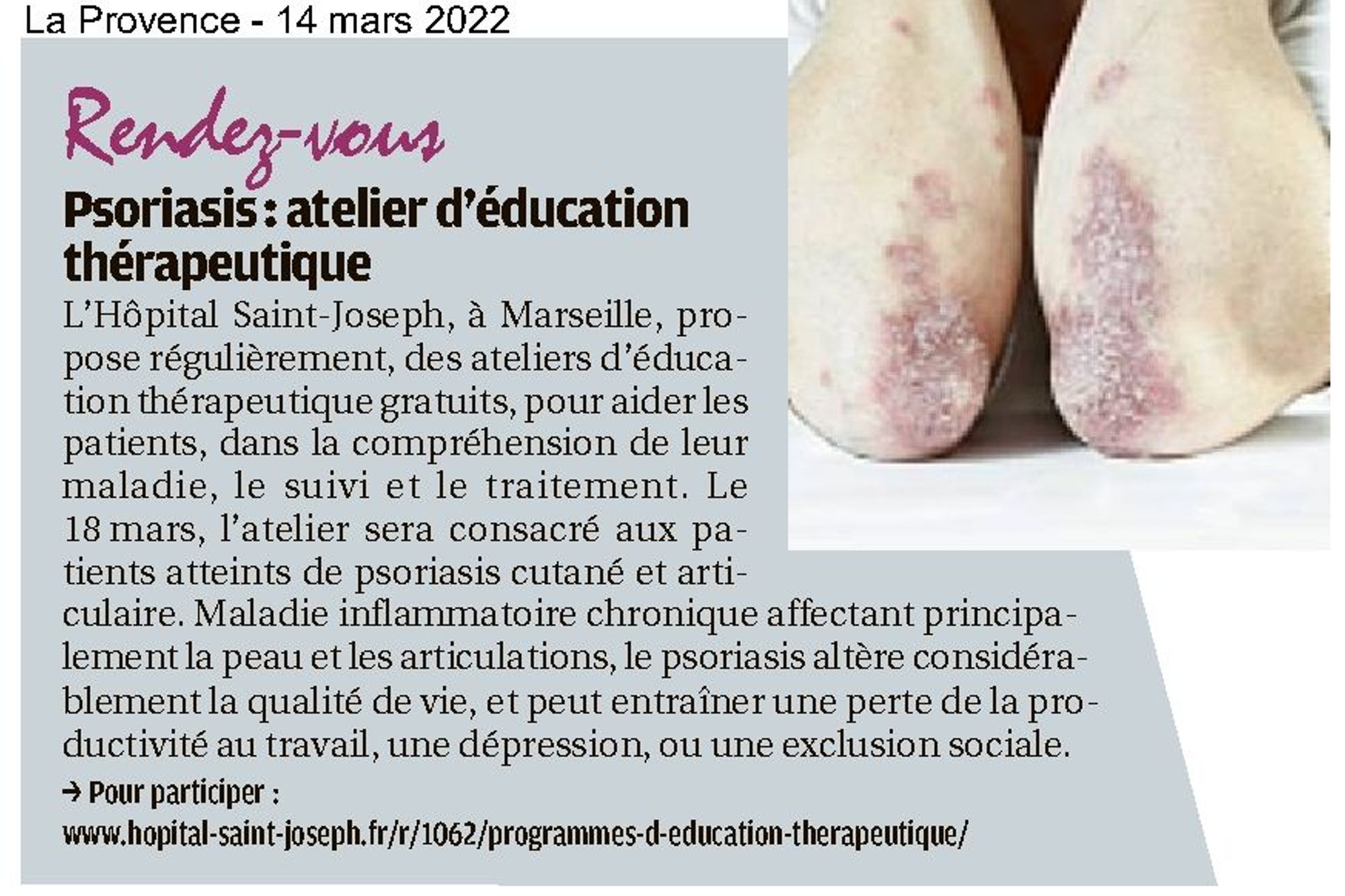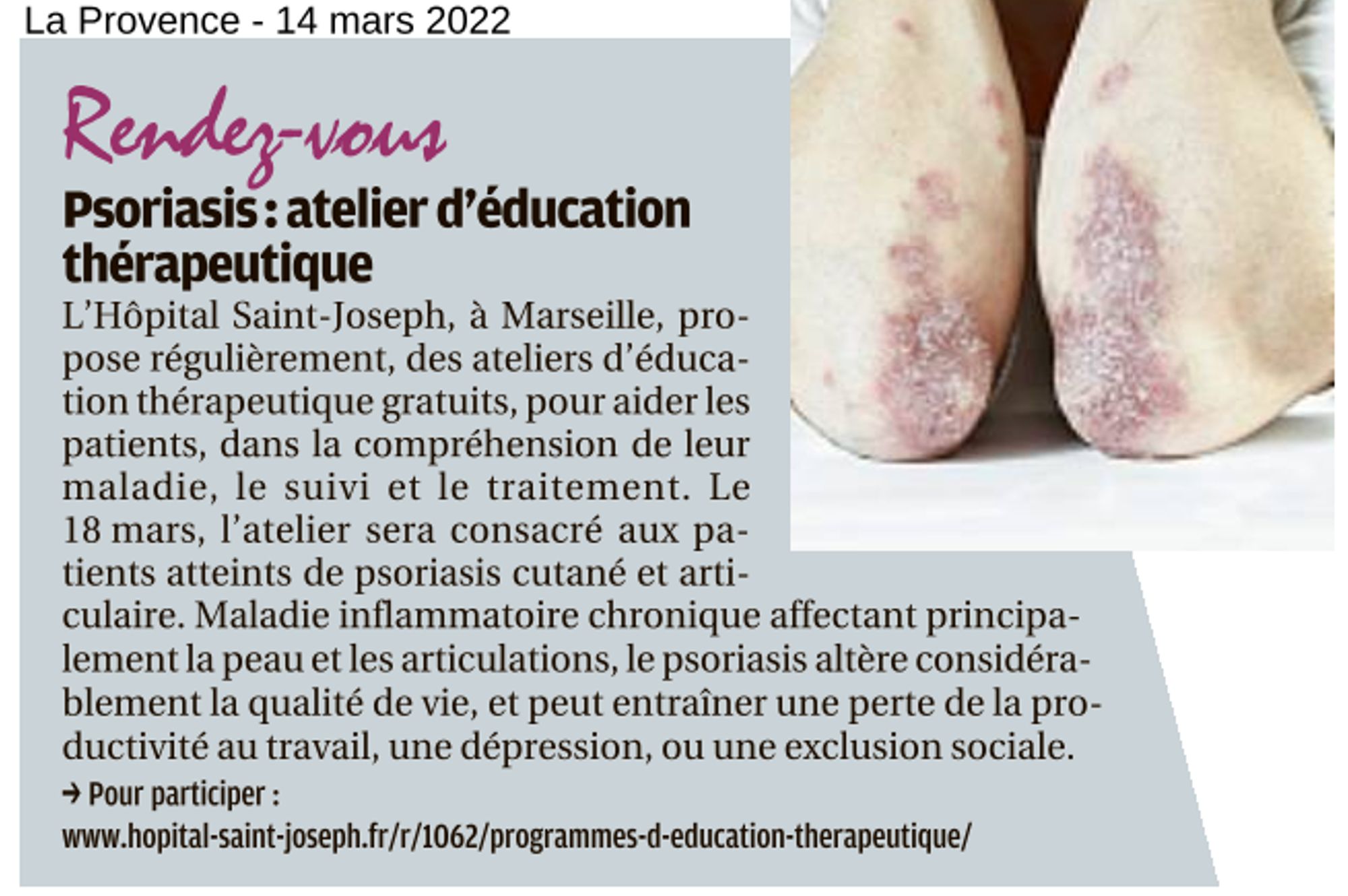 Psoriasis : atelier d'éducation thérapeutique La Provence, 14 mars 2022 La Provence, 14/03/2022 : Psoriasis : atelier d'éducation thérapeutique (337.7 Ko)