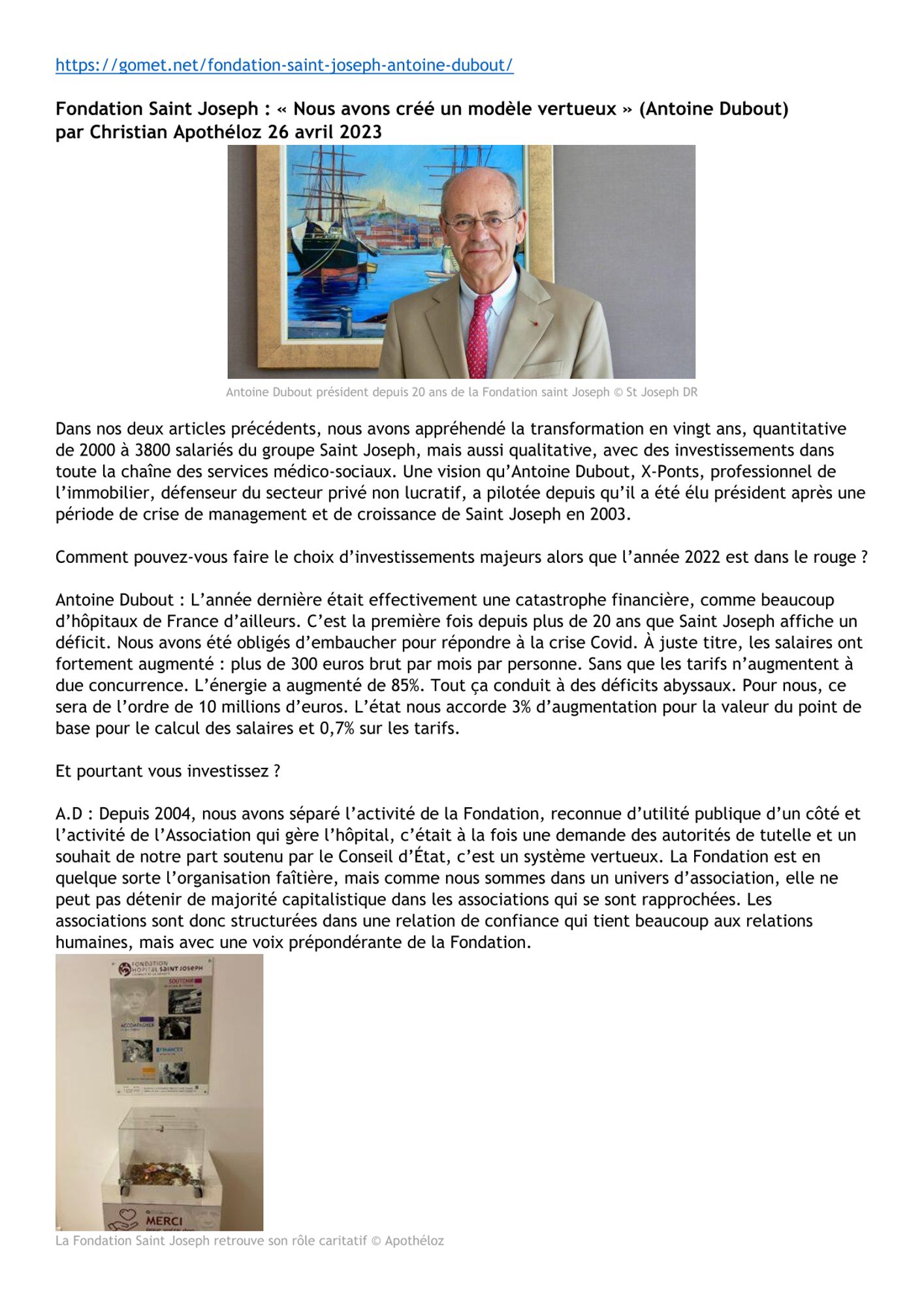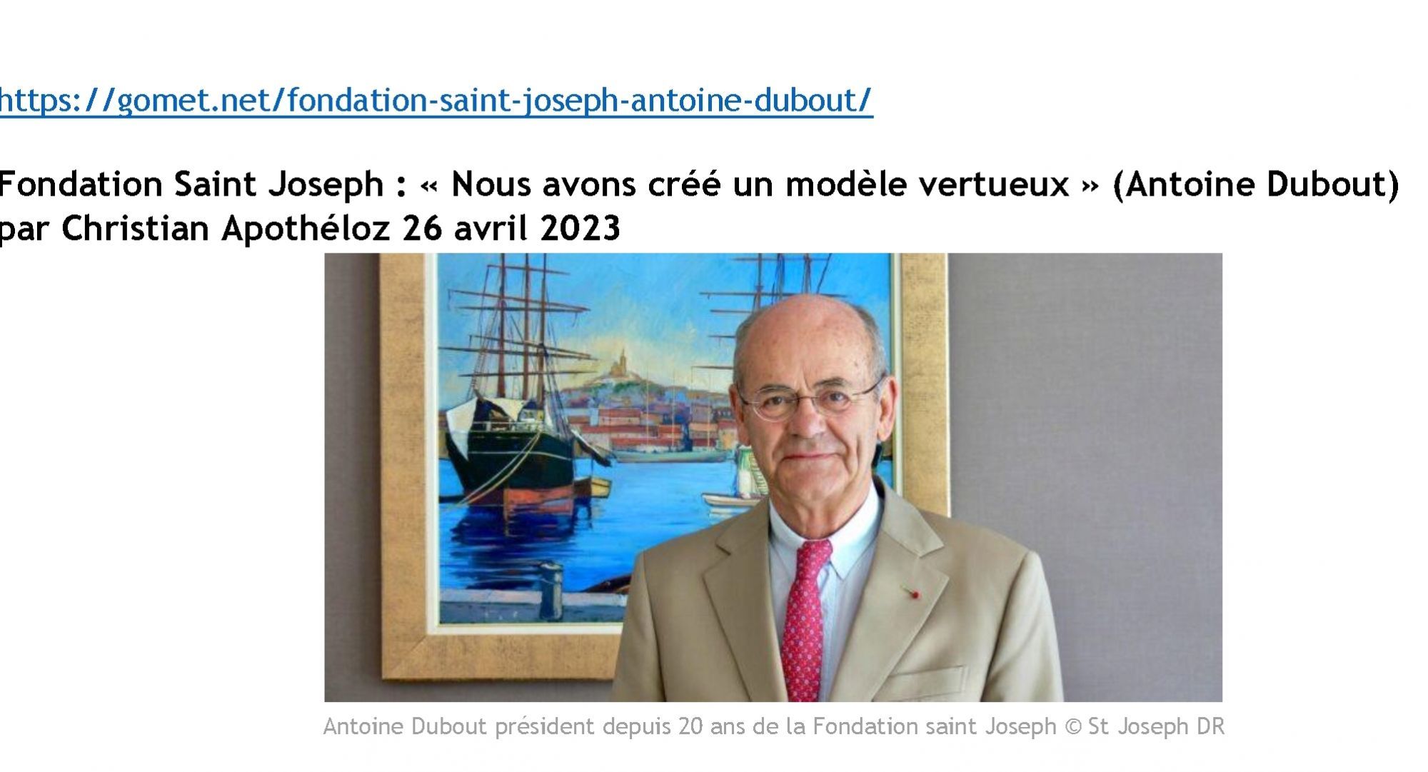 Fondation Saint Joseph : " Nous avons créé un modèle vertueux " (Antoine Dubout) : Gomet .net - 26/04/2023 Dernière modification : 20 novembre 2023 Fondation Saint Joseph : " Nous avons créé un modèle vertueux " (Antoine Dubout) : Gomet .net - 26/04/2023 (414.1 Ko)
