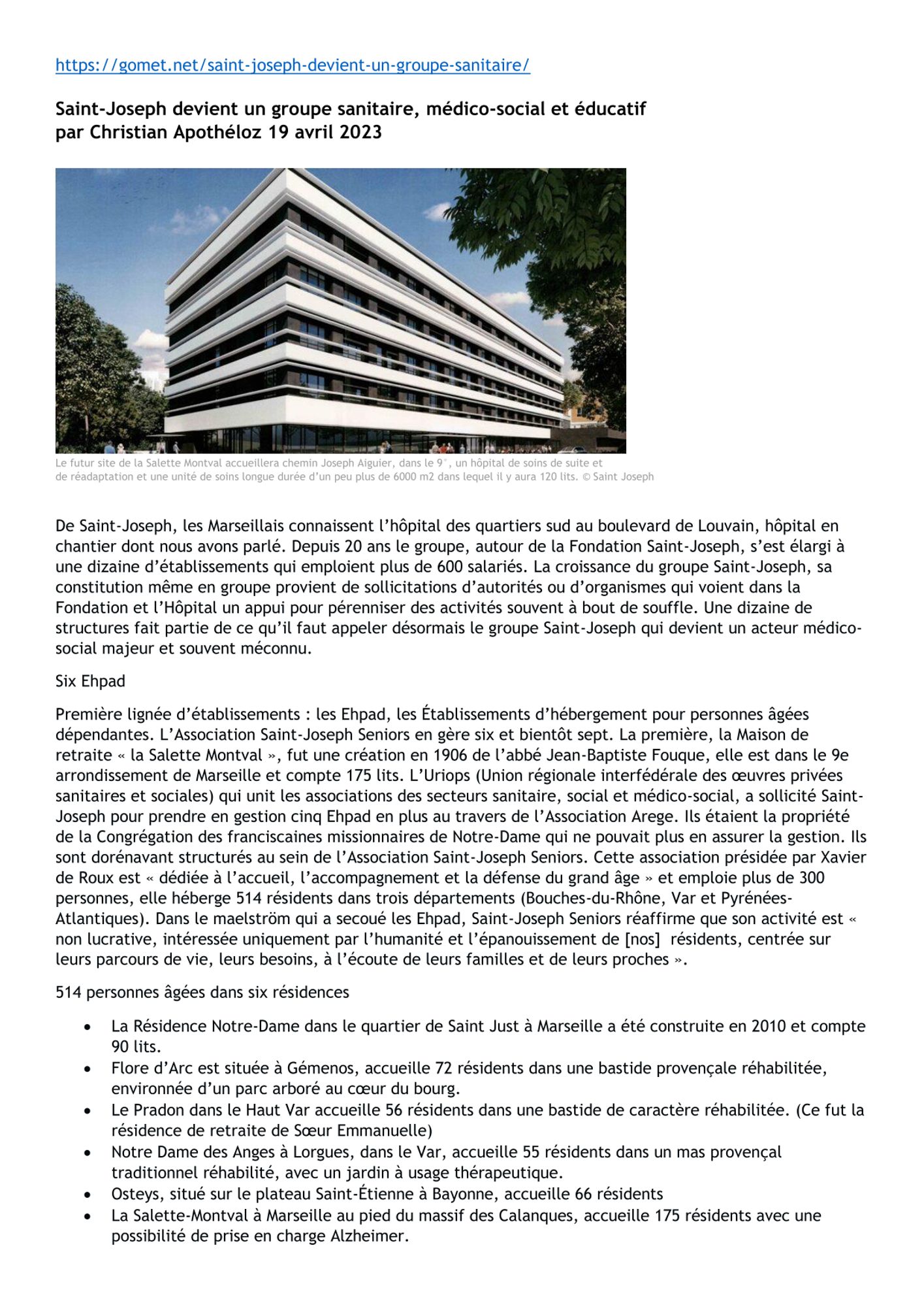 Saint-Joseph devient un groupe sanitaire, médical-social et éducatif : Gomet .net - 19/04/2023 Dernière modification : 20 novembre 2023 Saint-Joseph devient un groupe sanitaire, médical-social et éducatif : Gomet .net - 19/04/2023 (588.5 Ko)
