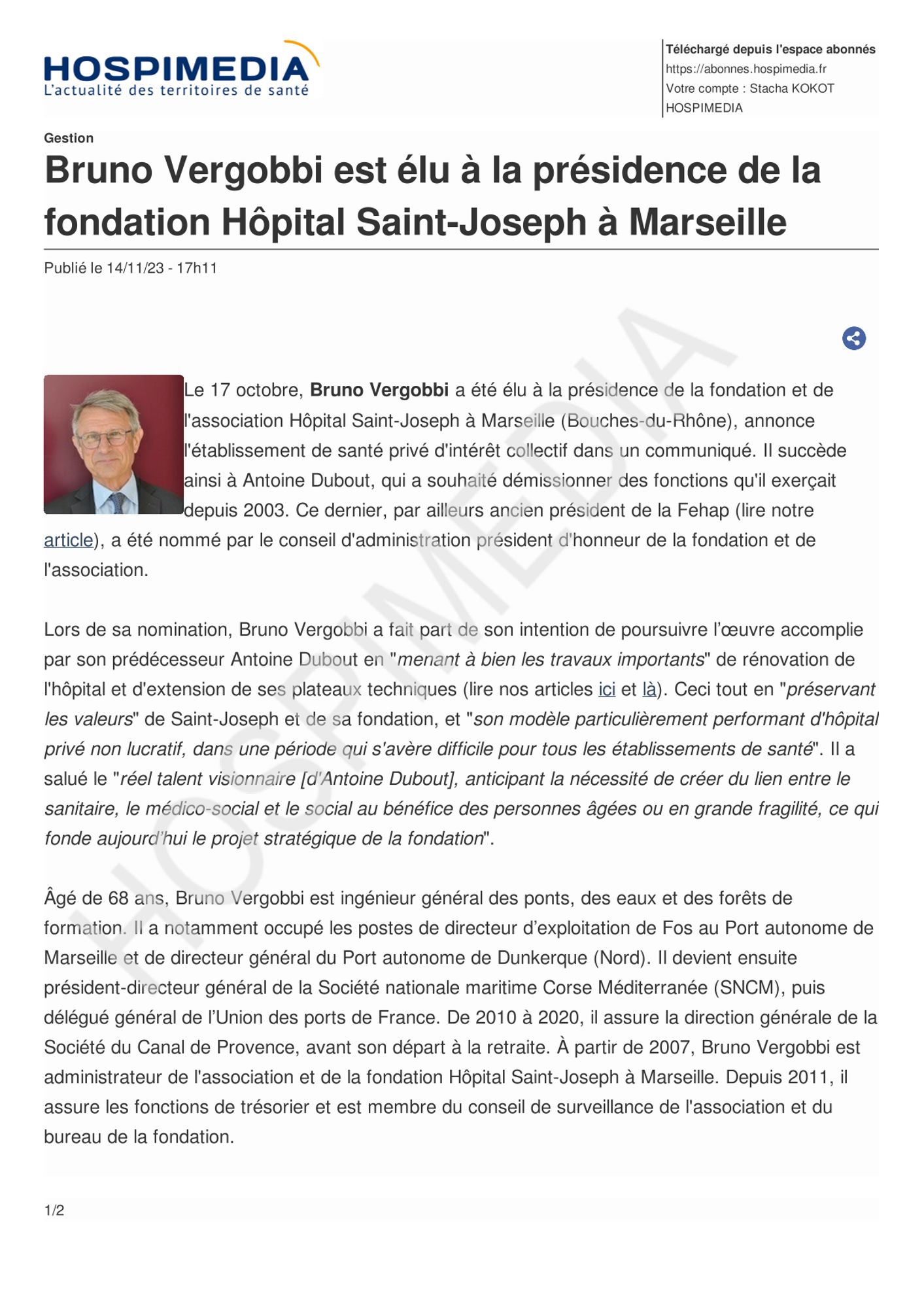 Gestion - Bruno Vergobbi est élu à la présidence de la fondation Hôpital Saint Joseph à Marseille : HOSPIMEDIA - 15/11/2023 Dernière modification : 20 novembre 2023 Gestion - Bruno Vergobbi est élu à la présidence de la fondation Hôpital Saint Joseph à Marseille : HOSPIMEDIA - 15/11/2023 (175.1 Ko)