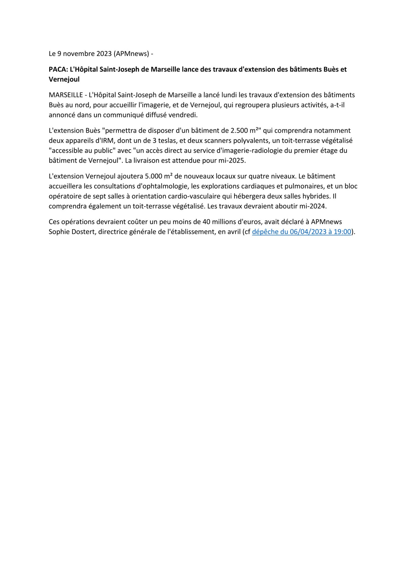 PACA : L'Hôpital Saint-Joseph de Marseille lance des travaux d'extension des bâtiments Buès et Vernejoul - APM News - 09/11/2023 Dernière modification : 20 novembre 2023 APM News PACA : L'Hôpital Saint-Joseph de Marseille lance des travaux d'extension des bâtiments Buès et Vernejoul - APM News - 09/11/2023 (414.6 Ko)
