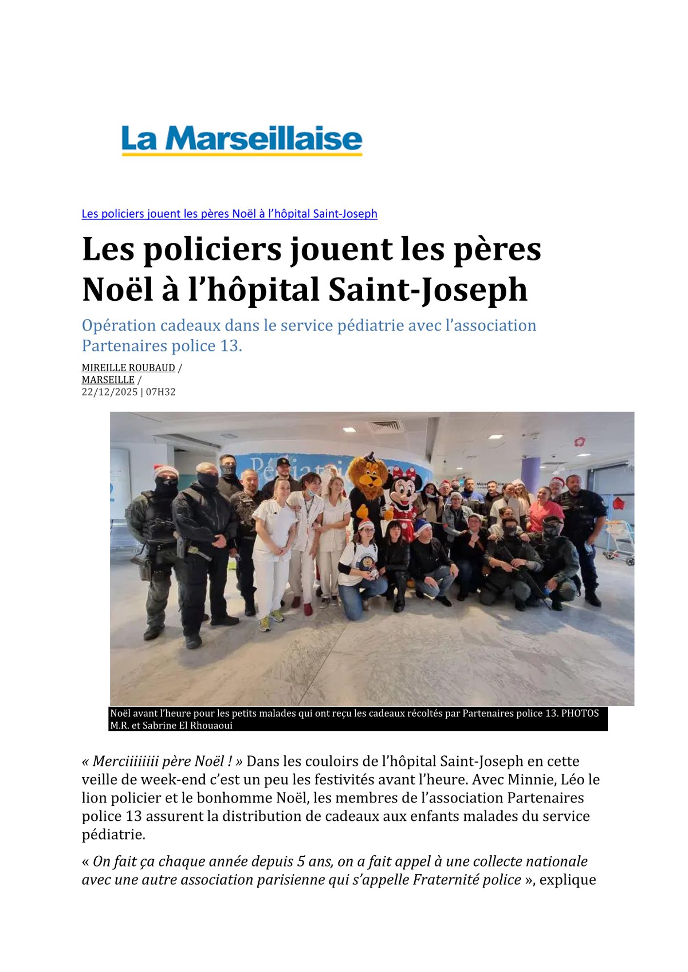 La Marseillaise, 20/12/2025 : Les policiers jouent aux pères Noel à l'Hôpital Saint Joseph LaMarseillaise_22122025_Les policiers jouent les peres noel à Hopital Saint Joseph.pdf (228.7 Ko)