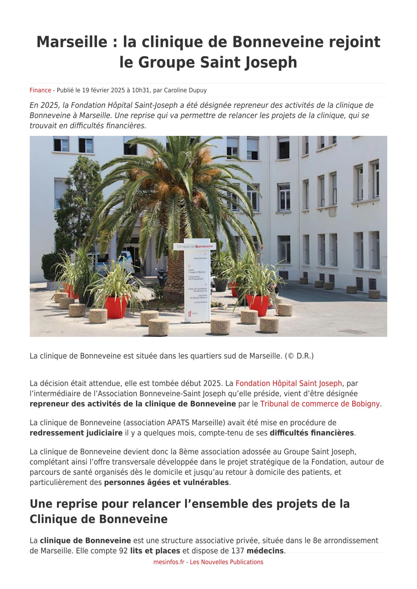 Mesinfos.fr - Les Nouvelles Publications, 19/02/2025 : Marseille : la clinique de Bonneveine rejoint le Groupe Saint Joseph Mesinfos.fr - Les Nouvelles Publications, 19/02/2025 : Marseille : la clinique de Bonneveine rejoint le Groupe Saint Joseph (185.3 Ko)