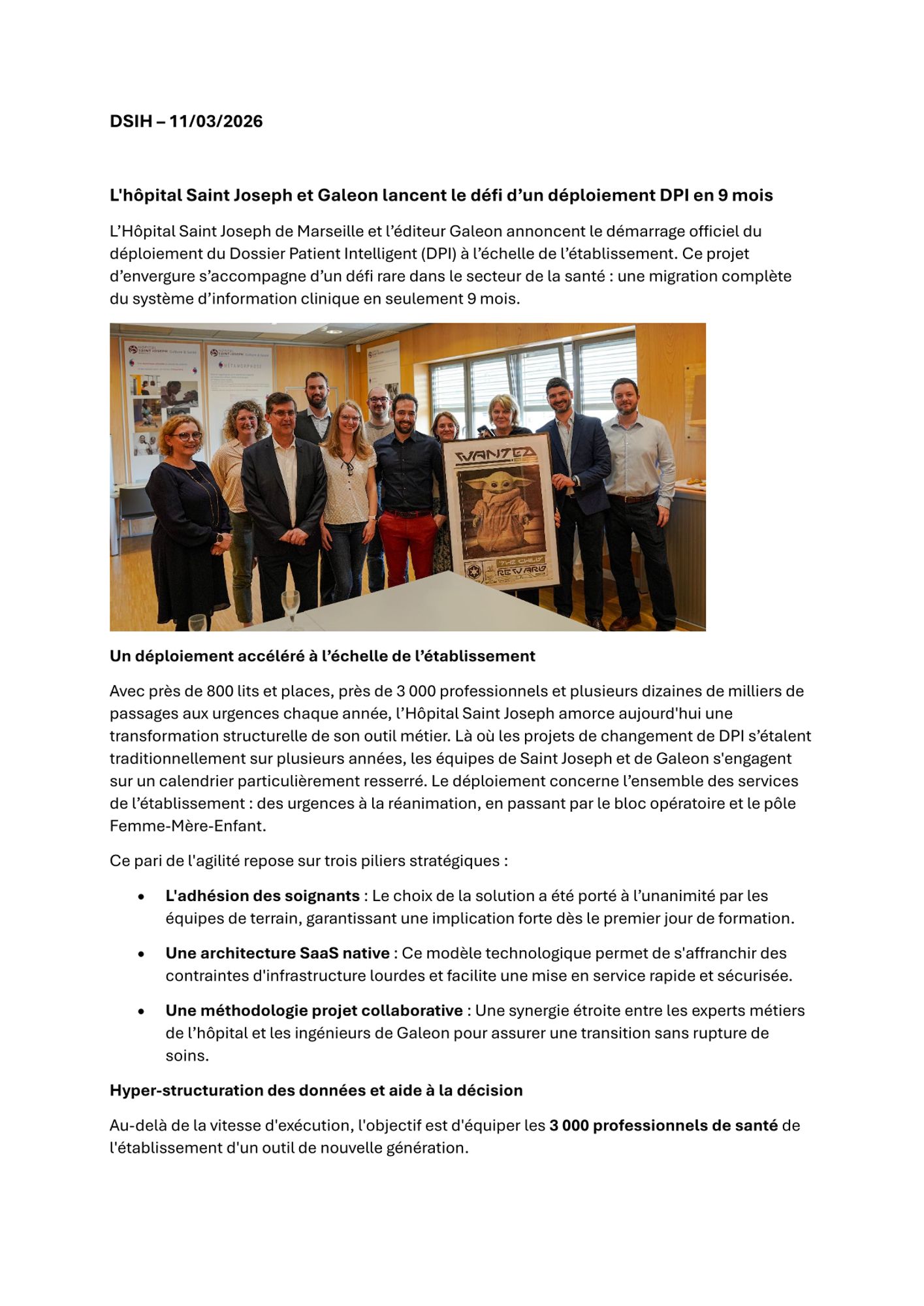 L'Hôpital Saint Joseph et Galeon lancent le défi d’un déploiement DPI en 9 mois L'Hôpital Saint Joseph et Galeon lancent le défi d'un déploiement DPI en 9 mois - DSIH (234.4 Ko)