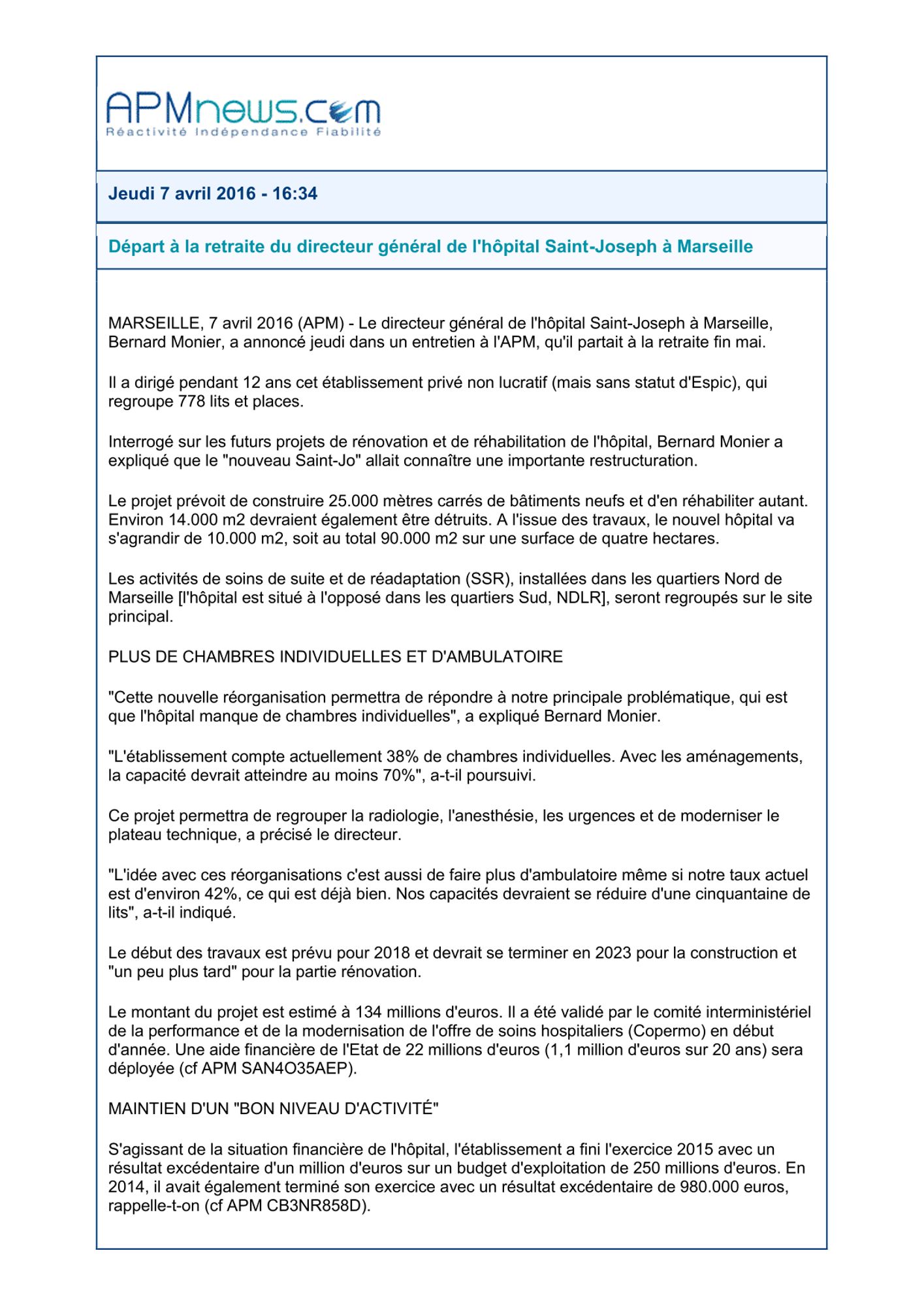 APM-news : Départ à la retraite du Directeur Général de l'Hôpital Saint Joseph. - 01 avril 2016