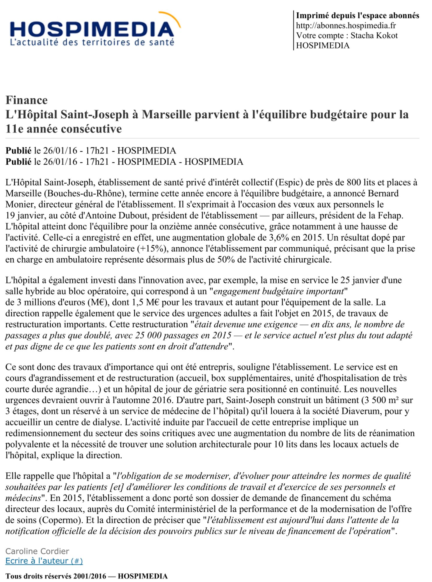 Hospimédia - L'Hôpital Saint Joseph parvient à l'équilibre budgétaire pour la 11ème année consécutive - 25 janvier 2016