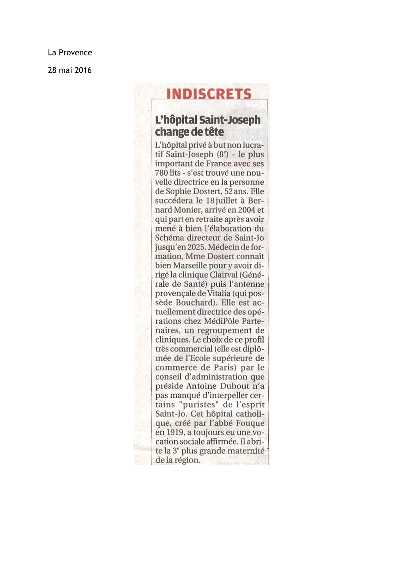 La Provence - L'hôpital Saint Joseph change de tête - 23 mai 2016 :