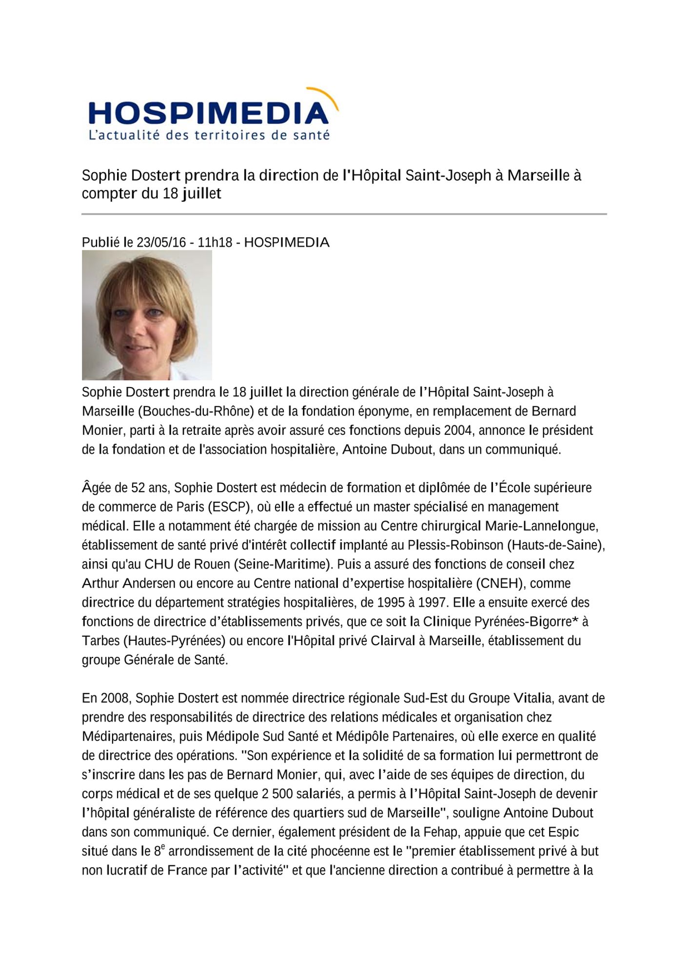 Hospimédia - Sophie Dostert prendra la direction de l'Hôpital Saint Joseph à Marseille à compter du 18 juillet 2016