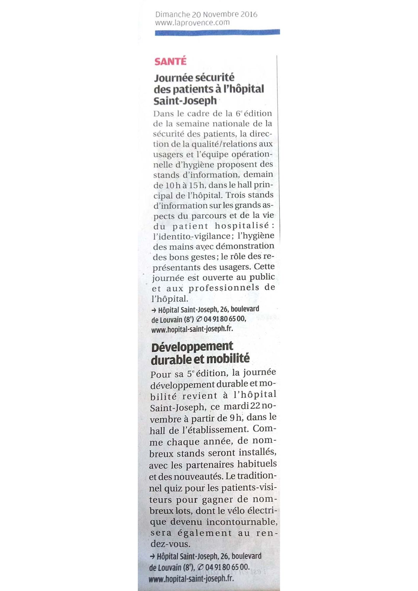 La Provence.com - Sécurité des patients et développement durable à l'Hôpital Saint Joseph - 06 novembre 2016 :