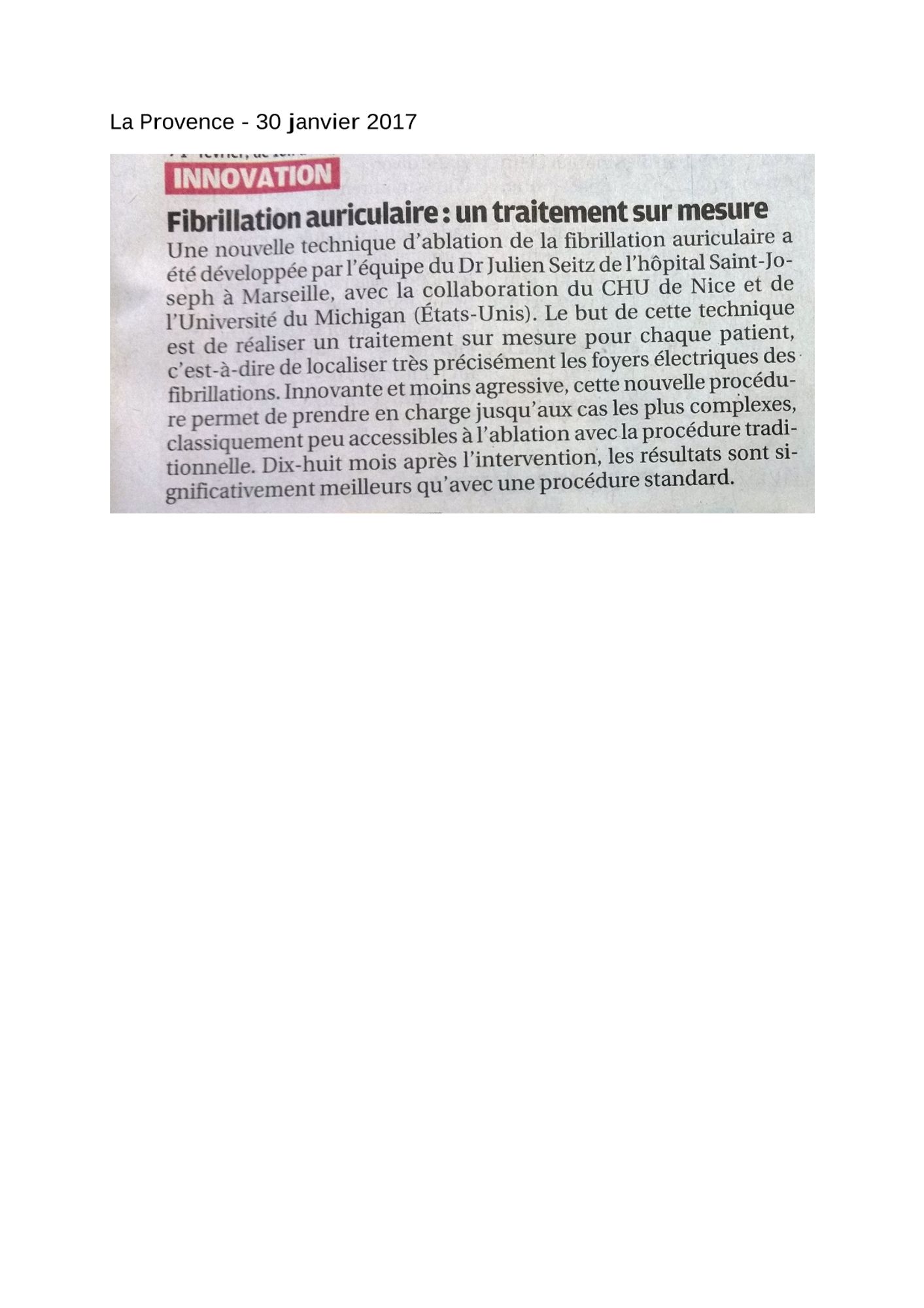 La Provence, 30/01/2017 : Fibrillation auriculaire : un traitement sur mesure 30/01/2017 : La Provence - Fibrillation auriculaire : un traitement sur mesure (464.7 Ko)