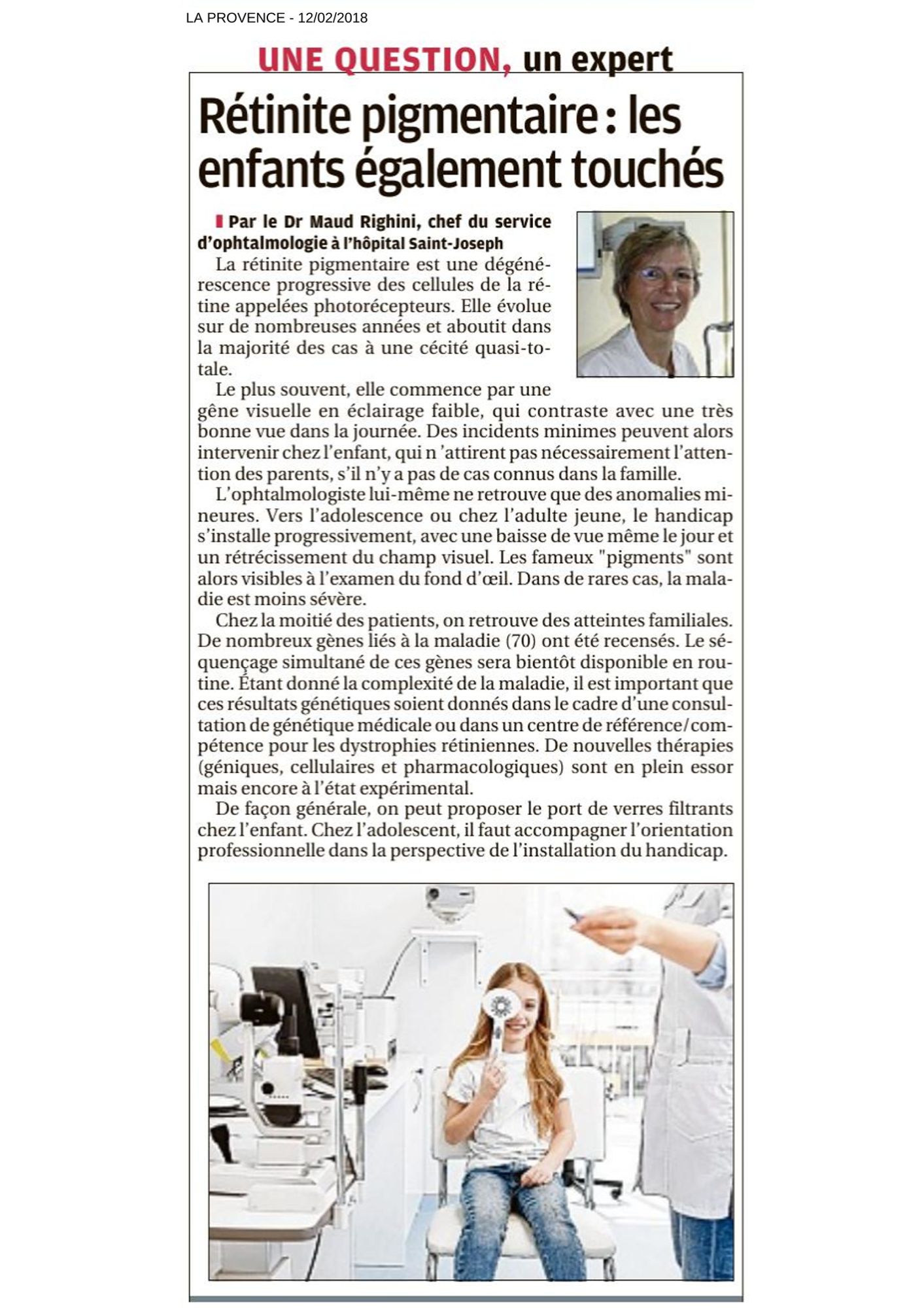 La Provence 12/02/2018 : Rétinite pigmentaire: les enfants également touchés La Provence du 12/02/2018: Rétinite pigmentaire: les enfants également touchés (1.1 Mo)