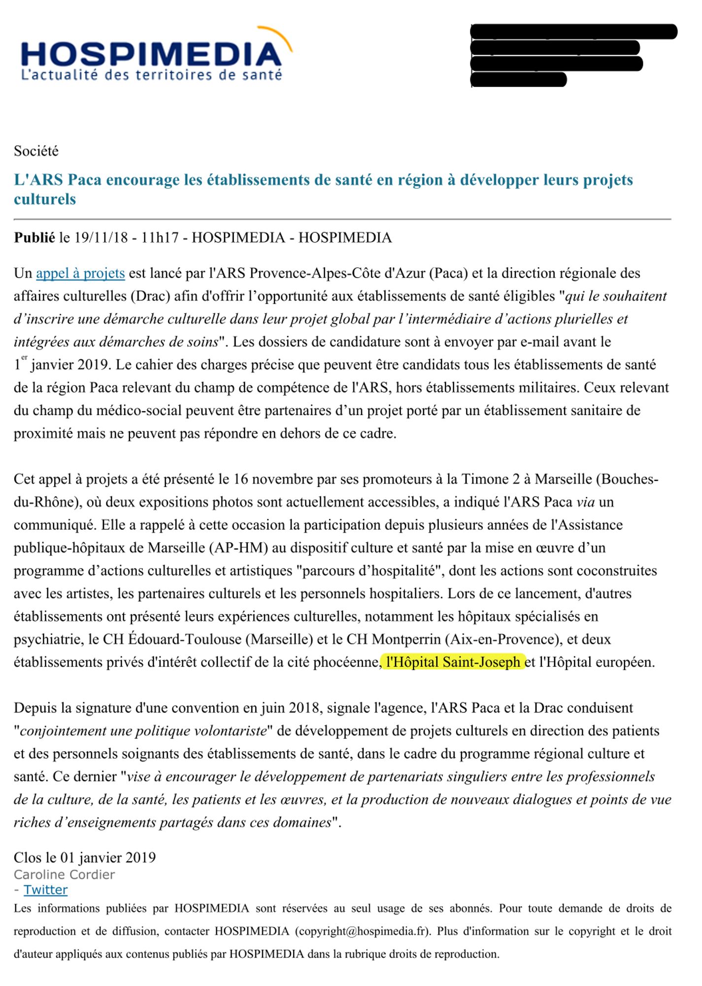 Hospimédia, 19/11/2018 : "L'ARS PACA encourage les établissements de santé en région à développer leurs projets culturels" Hospimédia, 19/11/2018 : "L'ARS PACA encourage les établissements de santé en région à développer leurs projets culturels" (96.9 Ko)