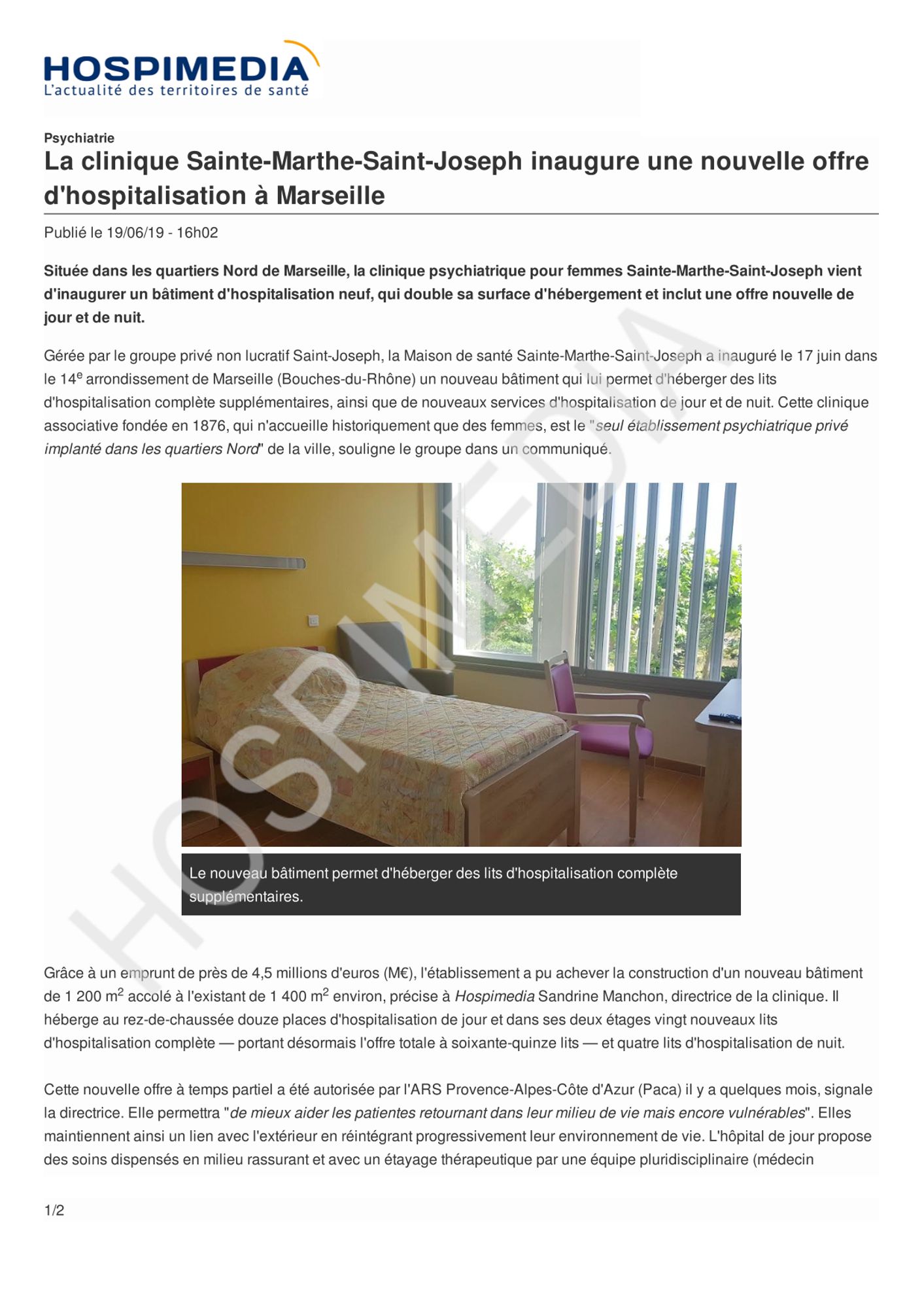 Hospimedia, 19/06/2019 : La clinique Sainte-Marthe-Saint-Joseph inaugure une nouvelle offre d'hospitalisation à Marseille Hospimedia, 19/06/2019 : La clinique Sainte-Marthe-Saint-Joseph inaugure une nouvelle offre d'hospitalisation à Marseille (423.9 Ko)