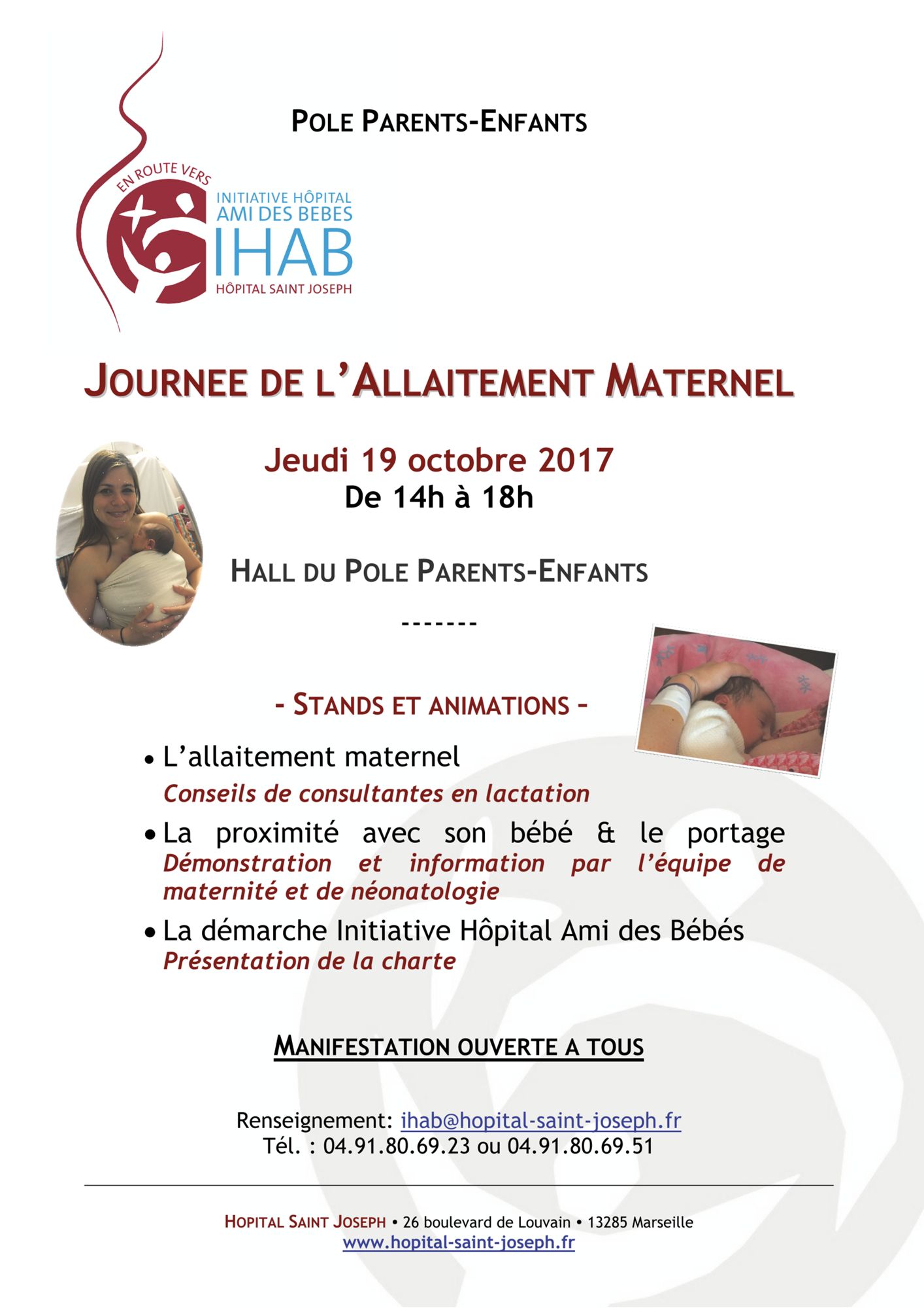 Dans le cadre de la démarche IHAB - L'Initiative Hôpital Ami des Bébés, les équipes du Pôle Parents-Enfants Sainte Monique vous proposent un stand d'information et des animations sur l'Allaitement Maternel le jeudi 19 octobre 2017 de 14h00 à 18h00 dans le hall du Pôle Parents-Enfants.