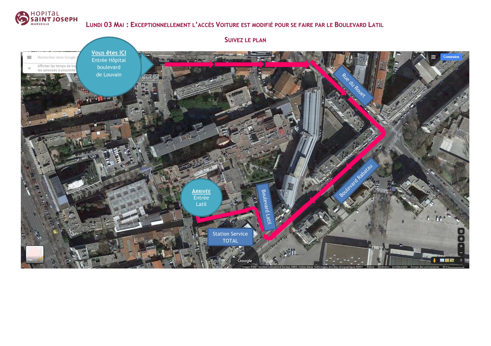Dans le cadre des travaux nécessaires à l'installation de la 3ème unité Scanner, l'entrée Boulevard de Louvain sera fermée aux voitures toute la journée du lundi 3 mai. Exceptionnellement l'entrée voitures se fera par le Boulevard Latil (voir plan).