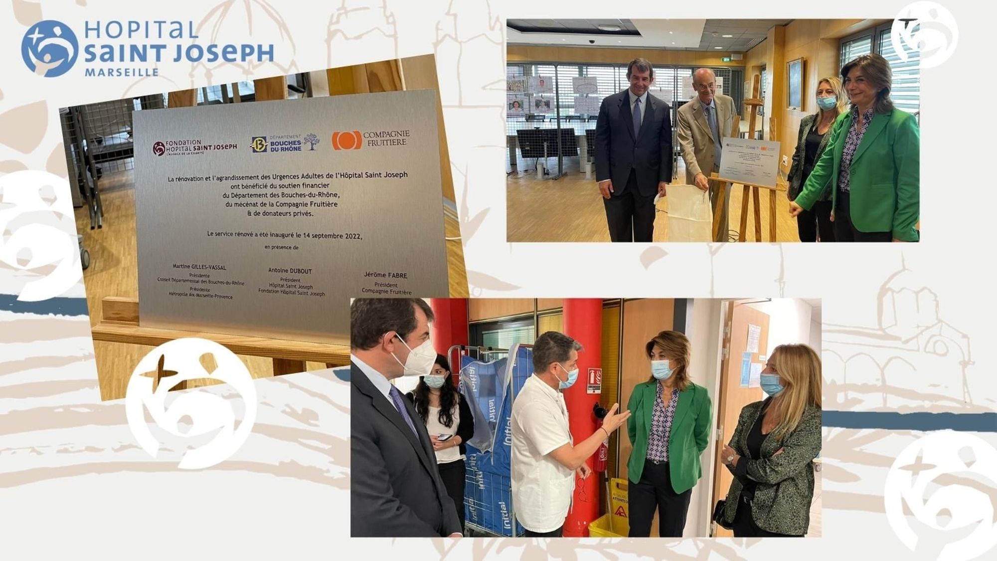 L'inauguration des travaux d'agrandissement et de rénovation des Urgences Adultes a eu lieu mercredi 14 septembre 2022, en présence de Martine Gilles-Vassal, Présidente du Conseil Départemental des Bouches-du-Rhône et Présidente de la Métropole Aix-Marseille Provence, et de Jérôme Fabre, Président de la Compagnie Fruitière, mécène de la Fondation Hôpital Saint Joseph, qui ont soutenu le projet, ainsi que de donateurs privés de la Fondation.