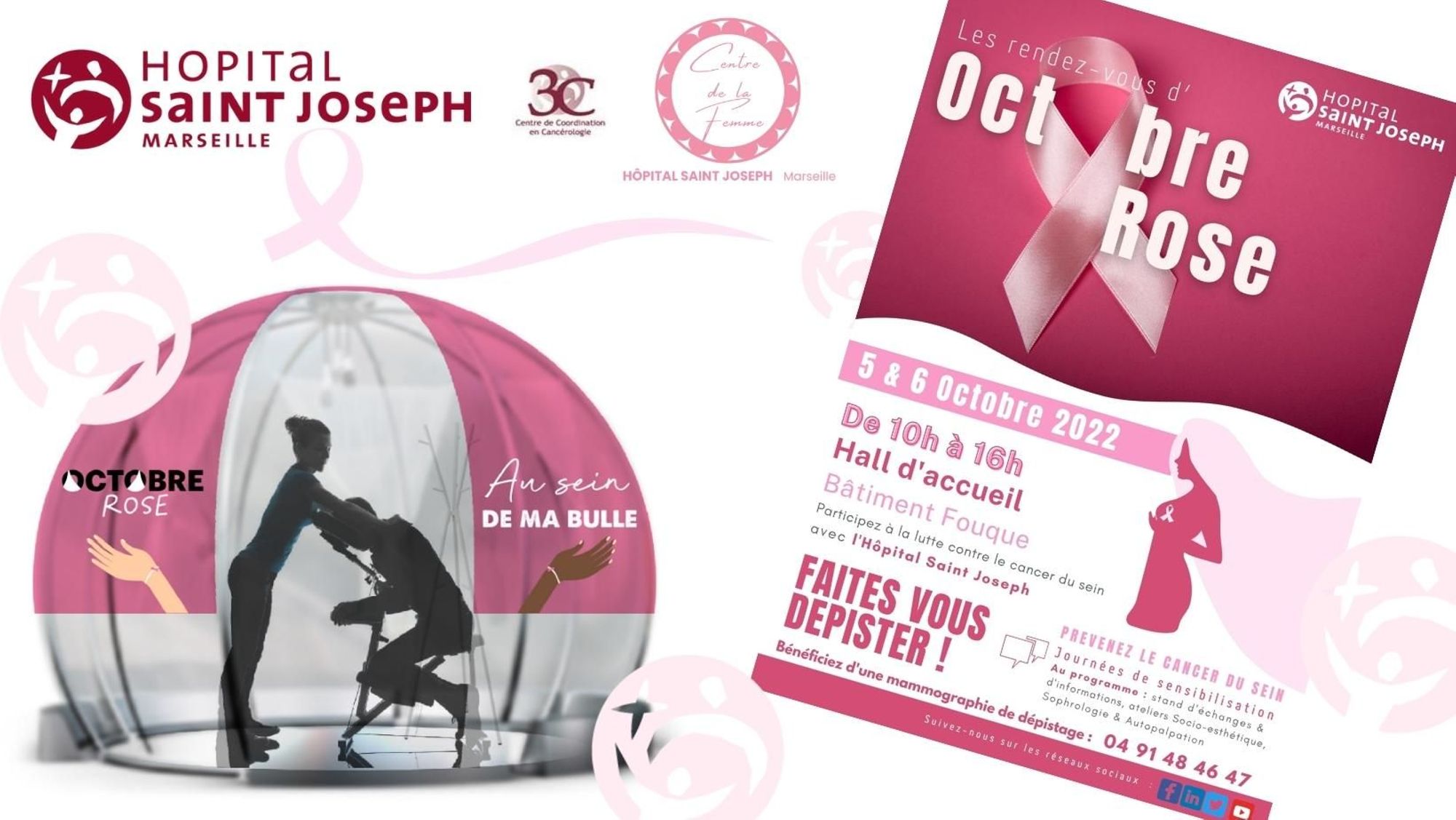 - 2 journées de sensibilisation et d’information les 5 et 6 octobre de 10h à 16h, « Au sein de ma bulle » -en partenariat avec le laboratoire DAIICHI-SANKYO-, un espace dédié et intime pour échanger librement autour du dépistage, mais aussi de la socio-esthétique, de la sophrologie et un atelier autopalpation (rendez-vous dans le grand hall du bâtiment Fouque).