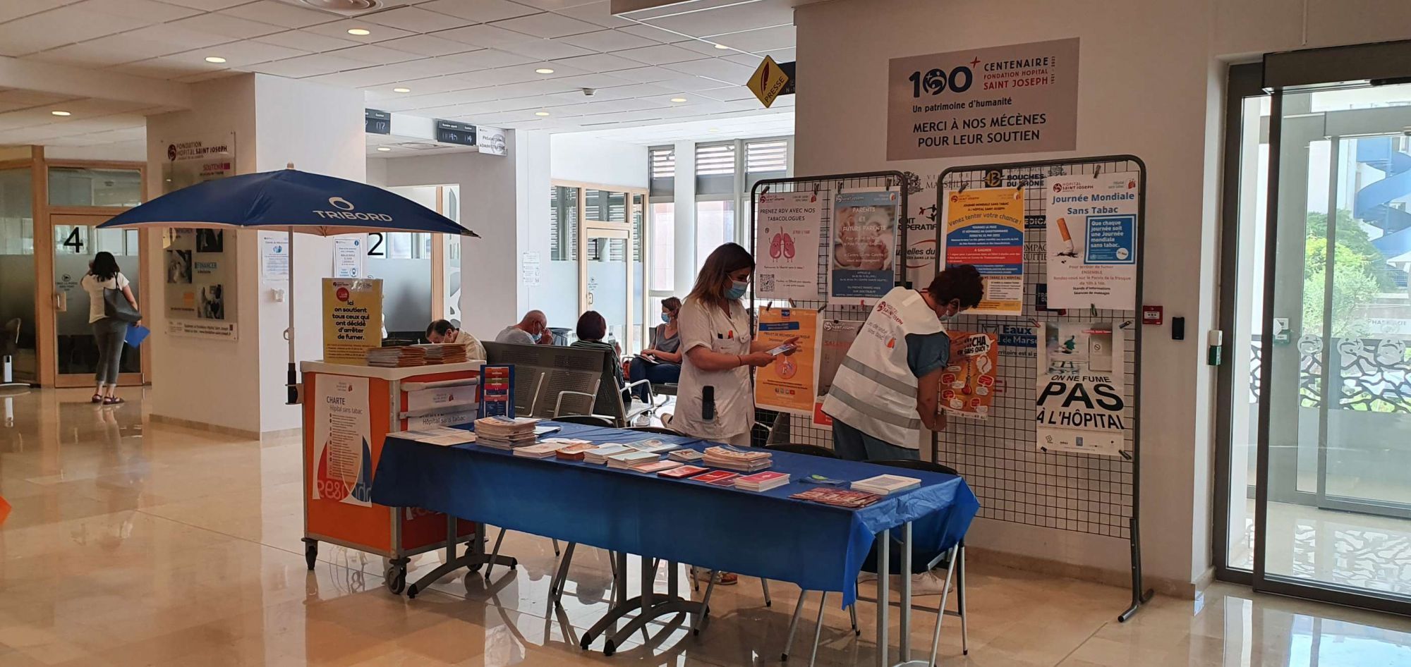 Ambassadeurs du Lieu de Santé sans Tabac, professionnels de santé ou de la sécurité incendie, enseignants sportifs, tous étaient réunis pour sensibiliser le personnel et le public au bienfait de l'arrêt du tabac et informer sur l'accompagnement possible à l'Hôpital Saint Joseph. Patients et personnel ont pu participer à une tombola en répondant aux questionnaires " Tabagisme en Blouse Blanche " du RESPADD.