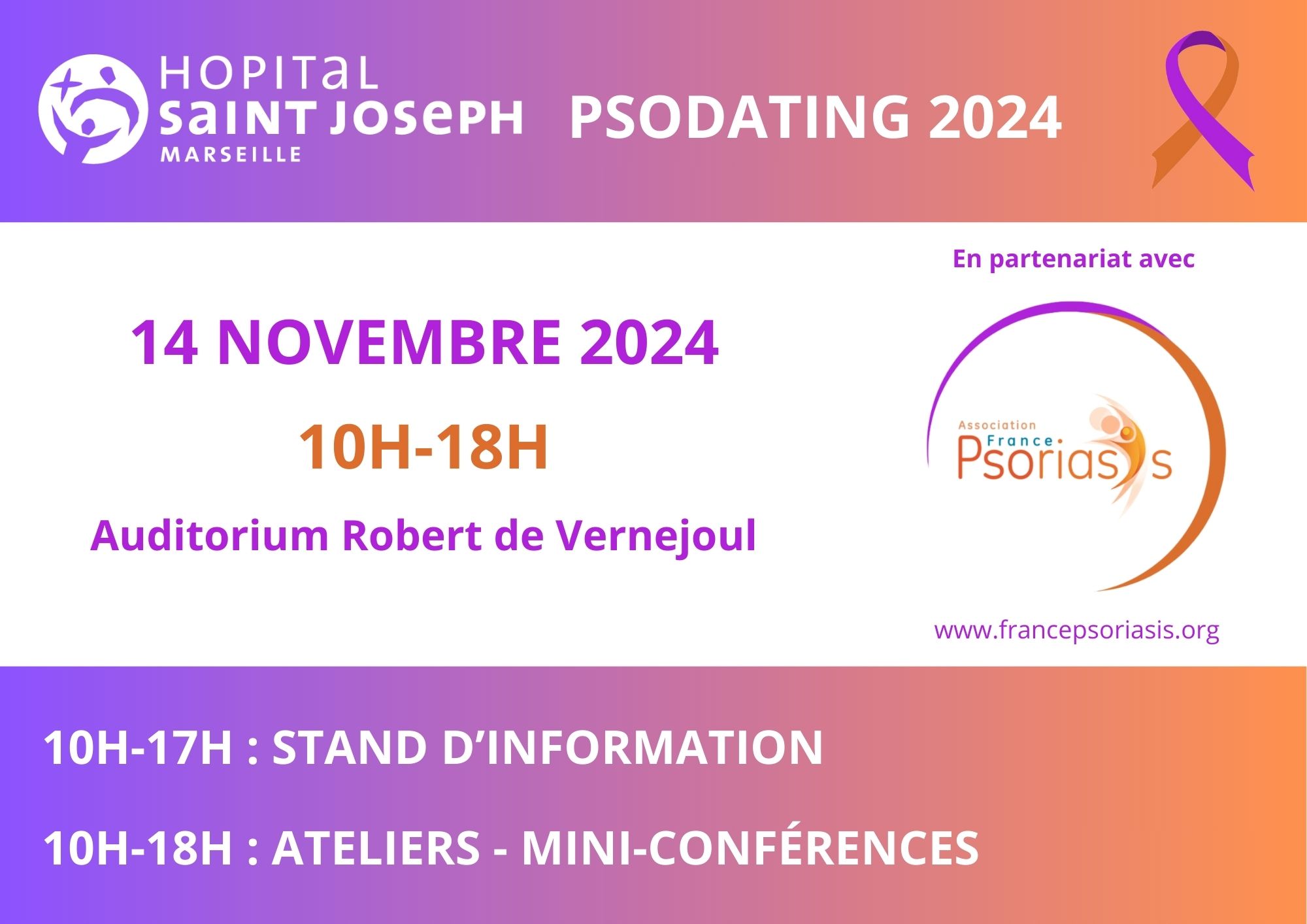L'Hôpital Saint Joseph et l’Association France Psoriasis organisent leur journée annuelle d’information sur le PSORIASIS le 14 novembre prochain.