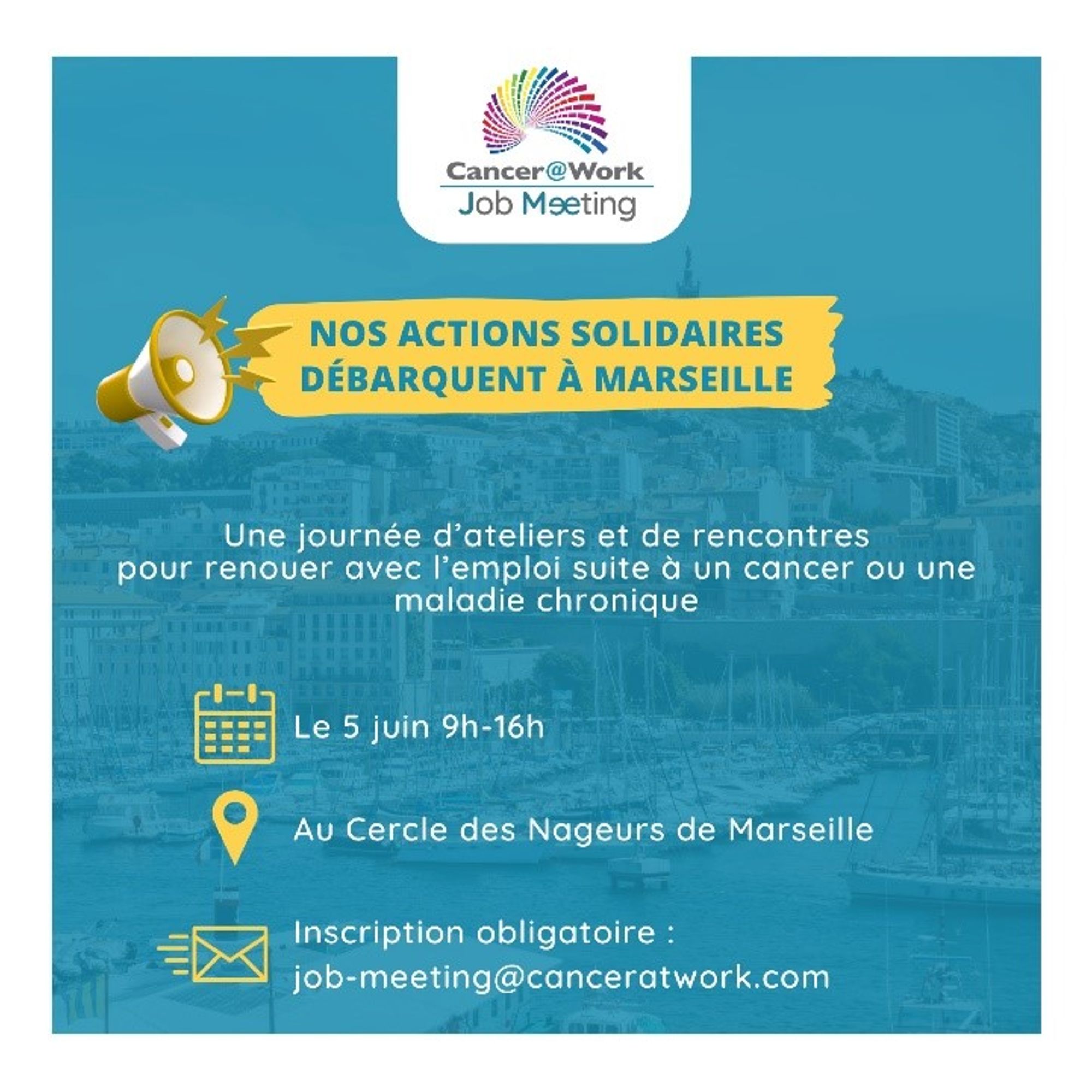Organisé par l’association Cancer@work, partenaire du service Oncologie-Hôpital de Jour de l’Hôpital Saint Joseph, un Job Meeting au Cercle des Nageurs de Marseille le 5 juin, de 9h à 16h pour aider les personnes touchées par un cancer ou une maladie chronique de renouer avec le monde professionnel.