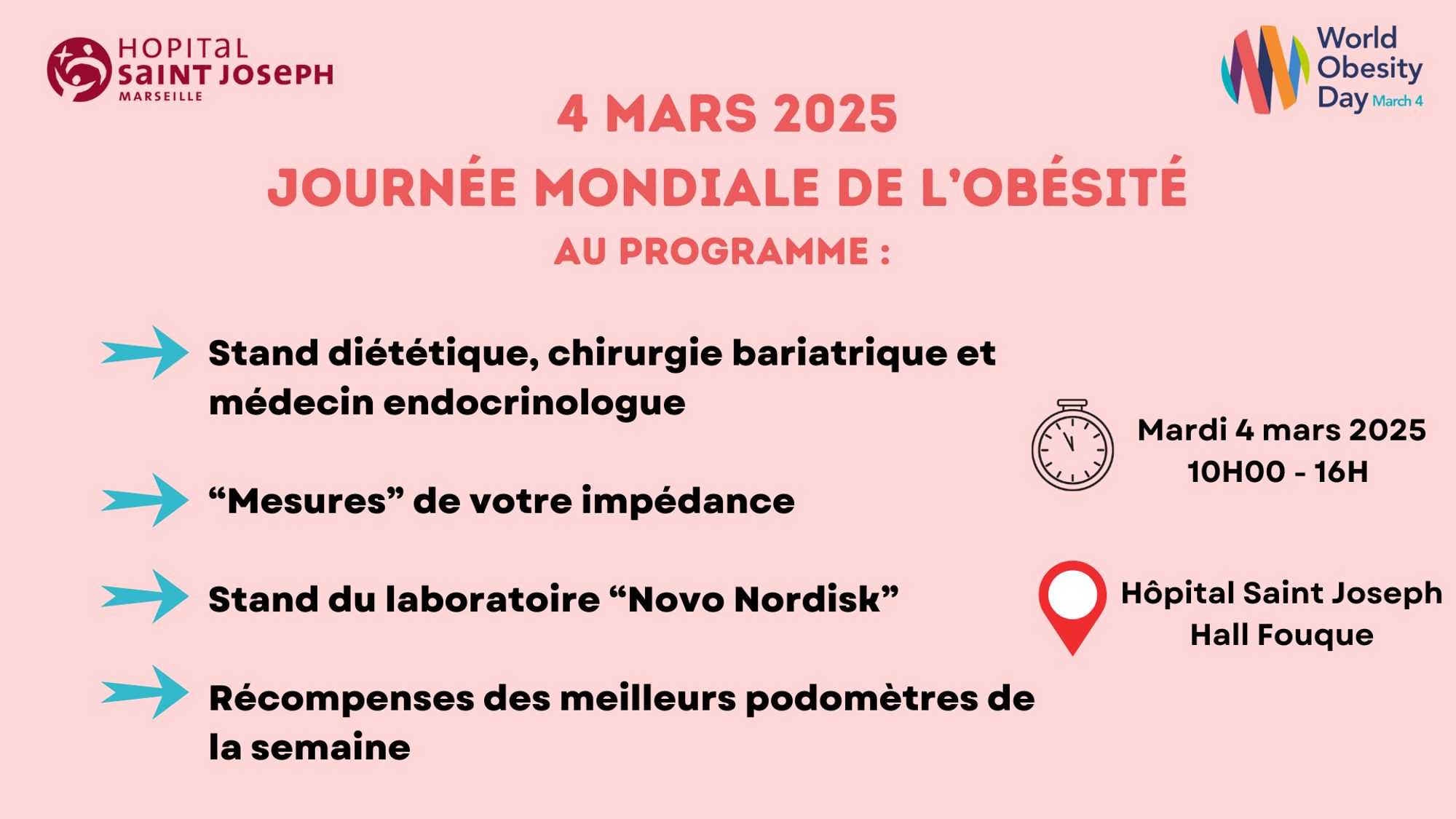 Dans le cadre de la journée mondiale de lutte contre l'obésité, le Centre de l’Obésité de l’Hôpital Saint Joseph organise une grande journée de sensibilisation et d’informations. Un programme riche attend les visiteurs : conseils diététiques, activité sportive avec le Pôle d’Activité Physique Adaptée de l’Hôpital, et la venue d’associations partenaires. Rendez-vous dès 10h dans le Hall Fouque pour découvrir les animations.