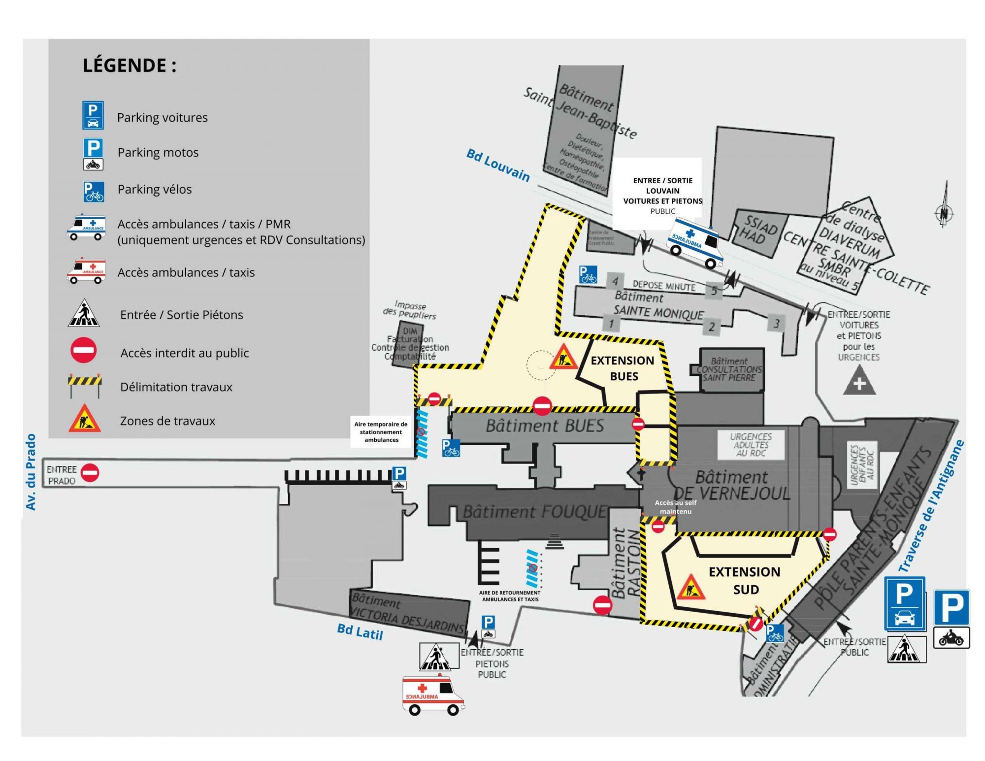 Dans le cadre des travaux d'extension des bâtiments Fouque et de Vernejoul et de la pose des palissades et barrières de chantier que cela entraîne, les circulations piétonnes, stationnements moto et accès aux bâtiments dans l'Hôpital sont modifiés.