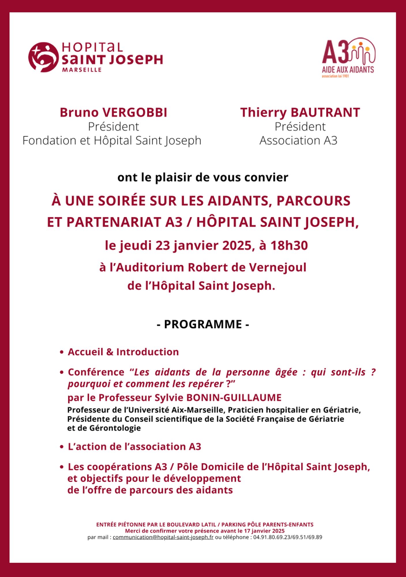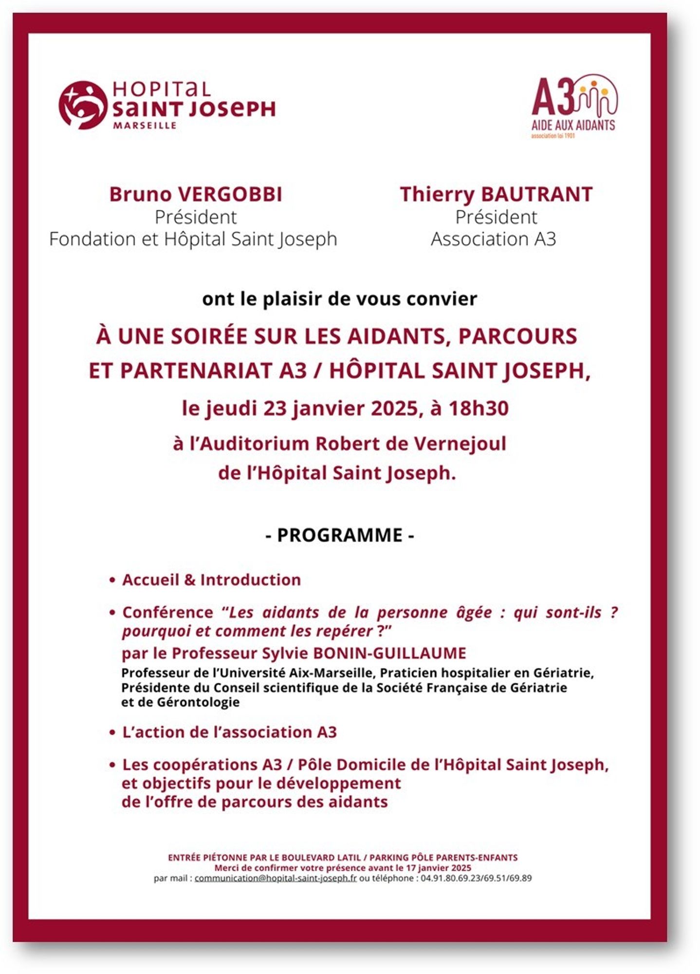 Jeudi 23 janvier, dès 18h30, Bruno Vergobbi, Président de la Fondation et de l'Hôpital Saint Joseph et Thierry Bautrant, Président Association A3 ont le plaisir de vous convier à une soirée sur le thème des aidants, et le parcours d'accompagnement que permet le partenariat de l'association A3 et l'Hôpital Saint Joseph. Rendez-vous à l'Auditorium Robert de Vernejoul pour mieux connaitre le rôle des aidants et les accompagnements possibles.