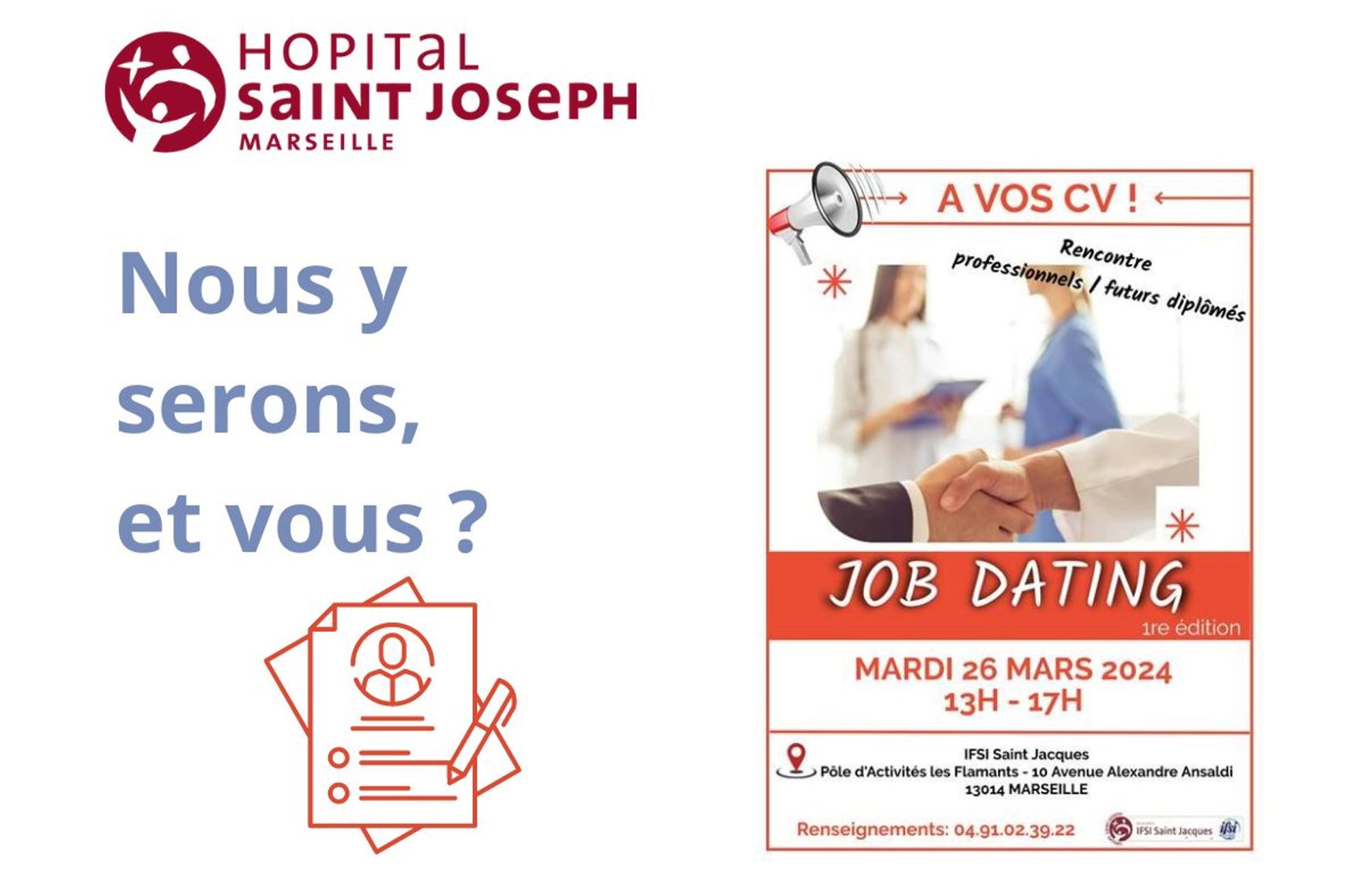 [#JOBDATING] Etudiants infirmiers, Infirmiers, venez nous rencontrer ! Ce mardi 26 mars, de 13h à 17h, nos équipes viennent à votre rencontre à l’IFSI Saint Jacques ! Dernière modification : 6 janvier 2025 job dating Futurs ou nouveaux diplômés, professionnels, venez échanger et découvrir les spécificités et l’ensemble des postes proposés à l’Hôpital Saint Joseph. Nous vous attendons nombreux !