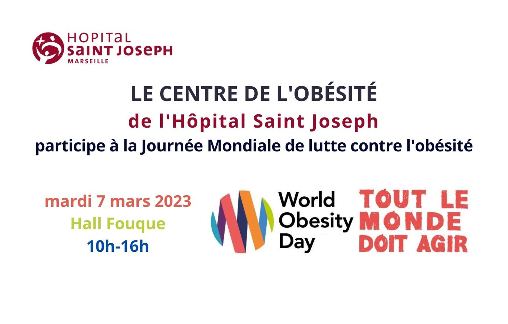 Organisée dans le cadre de la Journée mondiale de lutte contre l'obésité (World Obesity Day) du 4 mars, notre équipe pluridisciplinaire médicale et paramédicale et nos coachs sportifs vous attendent dans le grand hall Fouque le mardi 7 mars de 10 à 16h pour une journée de mobilisation.