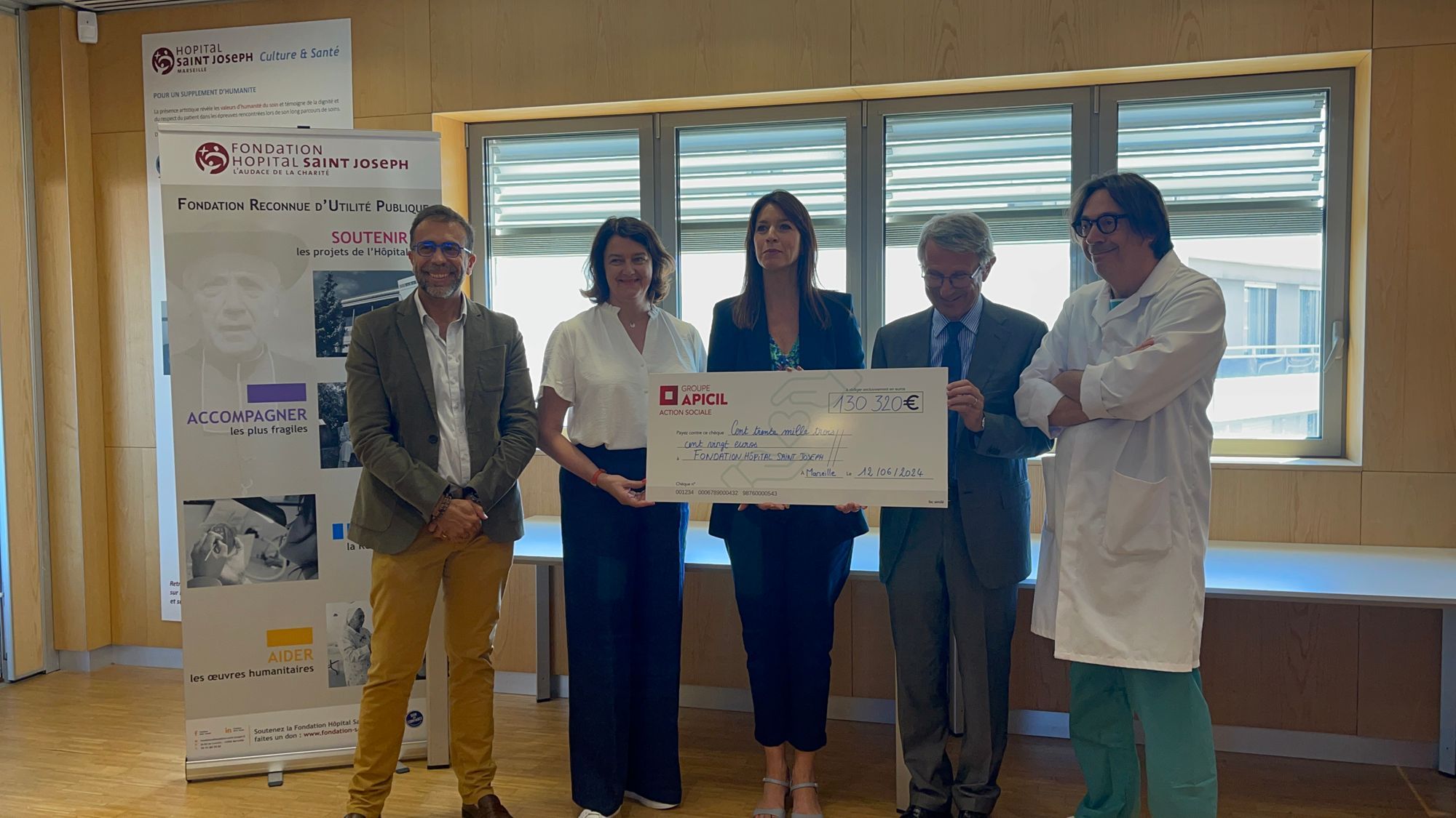 Jeudi 12 juin, Alexandra Caringi, Directrice Action sociale et Services de suivi médical Métier Santé-Prévoyance du Groupe Apicil était présente à l’Hôpital Saint Joseph pour remettre un chèque à Bruno Vergobbi, Président de la Fondation Hôpital Saint Joseph, pour soutenir l’acquisition d’un échographe, ainsi que d’un tablier de protection pour les opérateurs de la nouvelle salle hybride de l’Hôpital Saint Joseph.