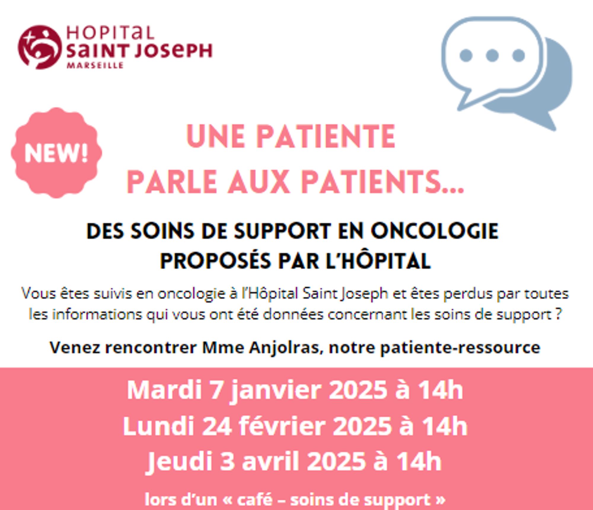 Le service Oncologie-Hôpital de Jour de l'Hôpital propose des soins de support pour l'accompagnement de ses patients. Pour mieux les découvrir, et pour permettre un temps de parole entre patients, un temps d'échange va être proposé régulièrement aux patients suivis par le service avec une patiente-ressource. Un moment convivial riche en échanges et informations pour mieux vivre avec la maladie.