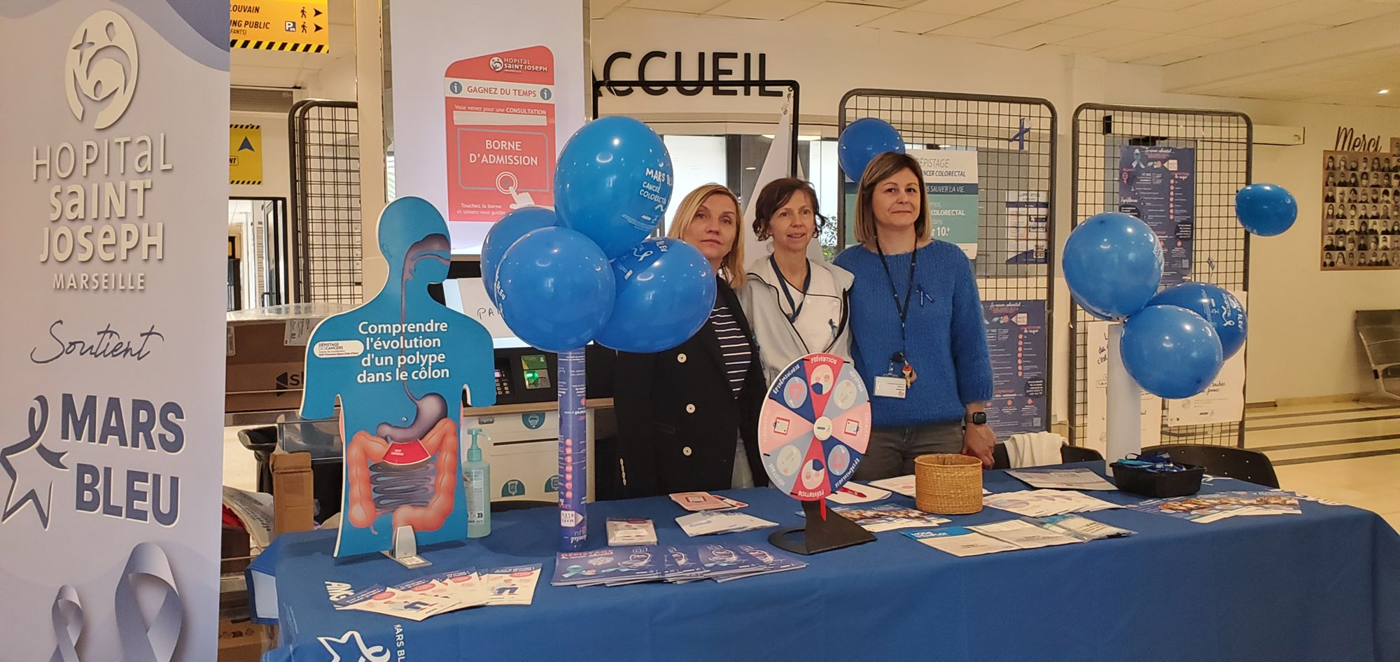 Quelques jours plus tard, c’était au tour du stand Mars Bleu, le 10 mars. Toute la journée, les équipes du Centre de Coordination en Cancérologie et de l’Hôpital de Jour Oncologie se sont mobilisées pour répondre aux questions sur cet enjeu majeur : le dépistage du cancer colorectal.