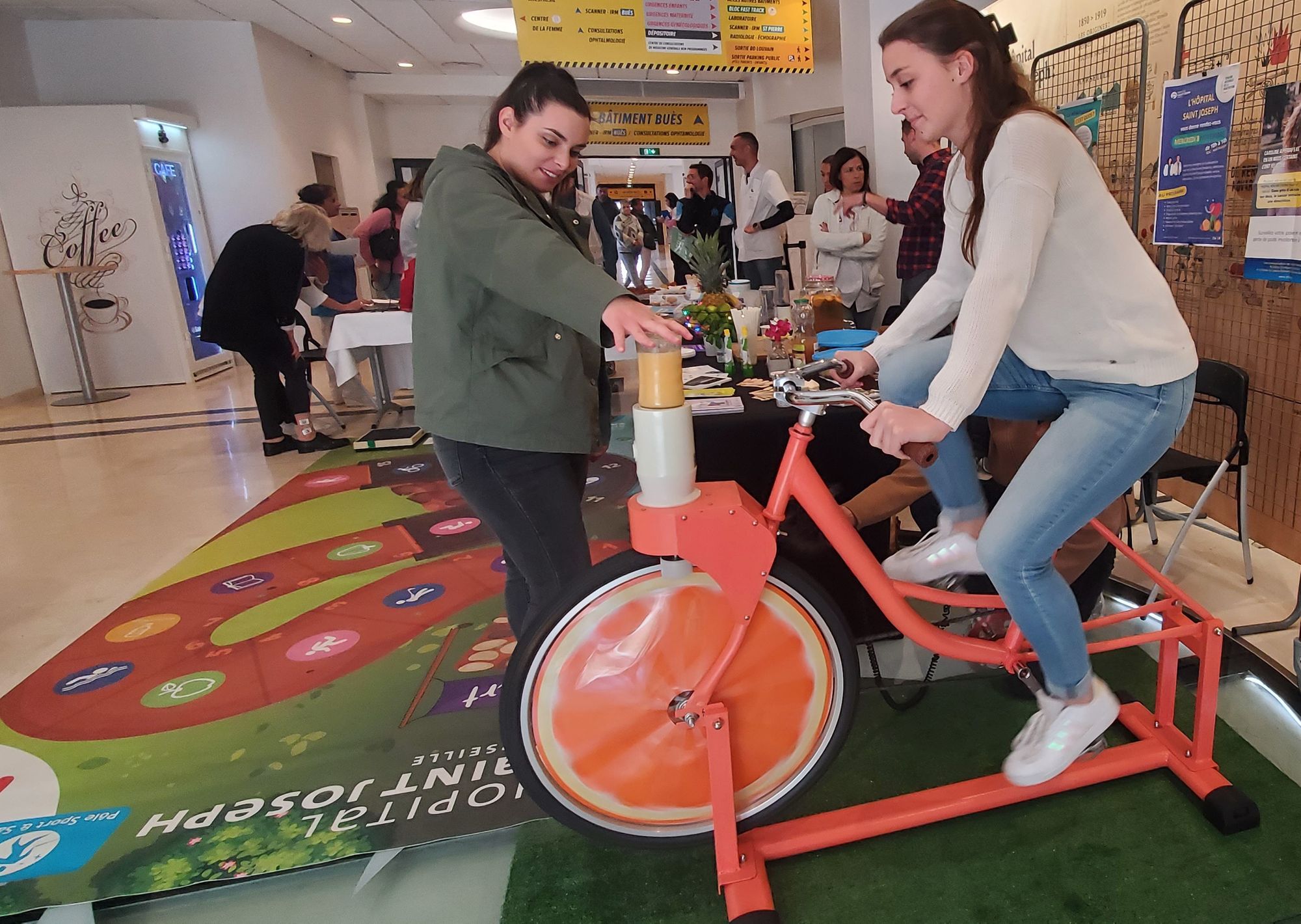 C’est à l’occasion de la semaine nationale de la dénutrition organisée du 7 au 14 novembre dernier, que les nutritionnistes et diététiciens de l’Hôpital Saint Joseph ont proposé une journée de mobilisation contre la dénutrition, dans le hall de l'Hôpital, avec la participation de plusieurs professionnels (médecin coordonnateur de la nutrition artificielle, diététiciens nutritionnistes, coaches APA, service restauration…). Cette journée avait pour objectif de sensibiliser sur l’importance de la lutte contre la dénutrition. Objectif réussi pour nos professionnels qui ont accueilli et informé une centaine de visiteurs ! Chacun a pu découvrir sa composition corporelle, « déguster » des compléments alimentaires et se préparer de délicieux smoothies en pédalant sur le vélo-blender !