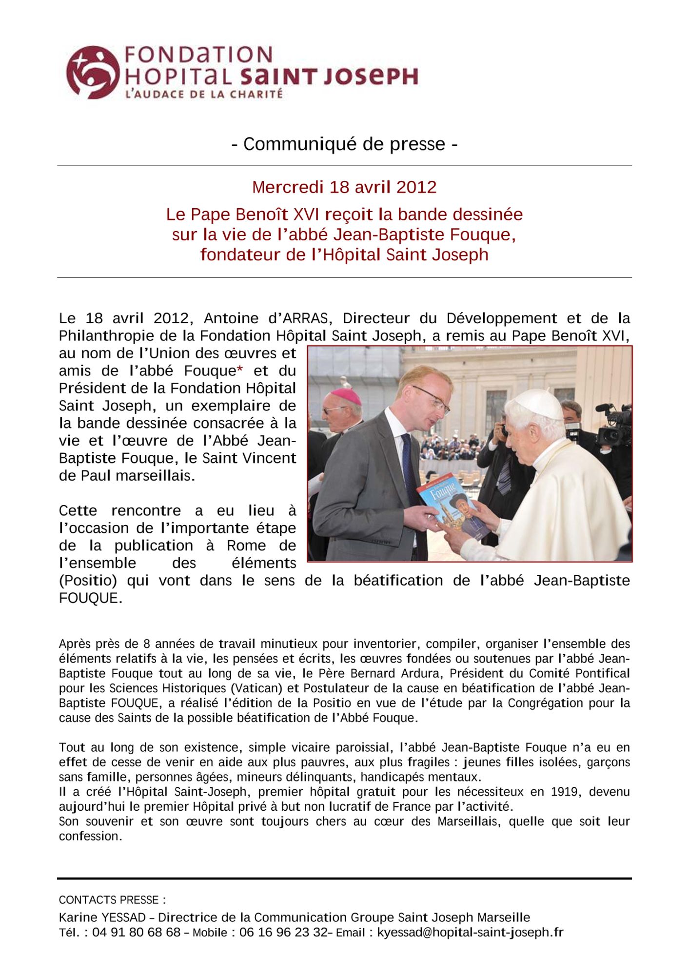 Le Pape Benoit XVI reçoit la bande dessinée sur la vie de l'Abbé Jean Baptiste Fouque - Jeudi 29 mars 2012 :