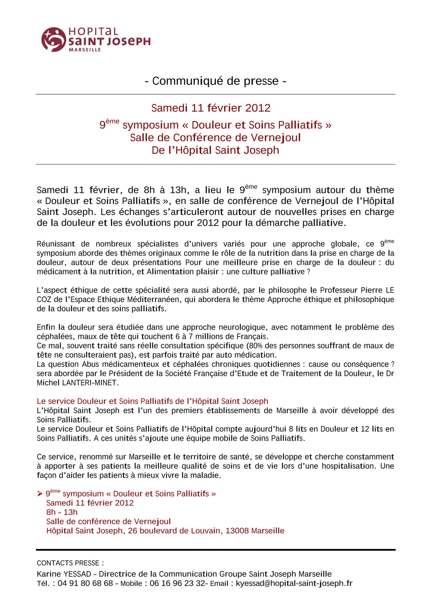 12ème symposium "Douleur et Soins Palliatifs" - Jeudi 26 janvier 2012 :