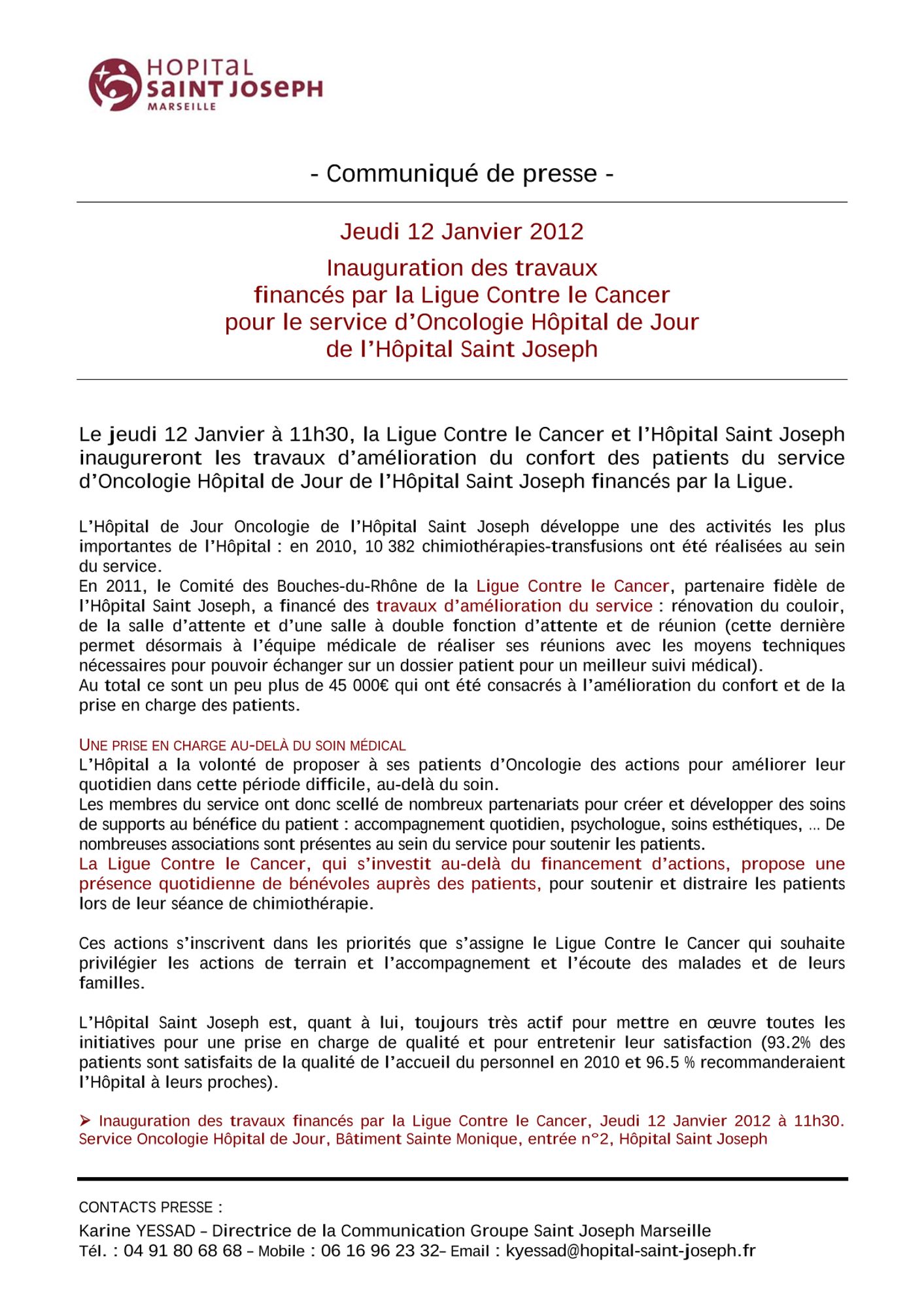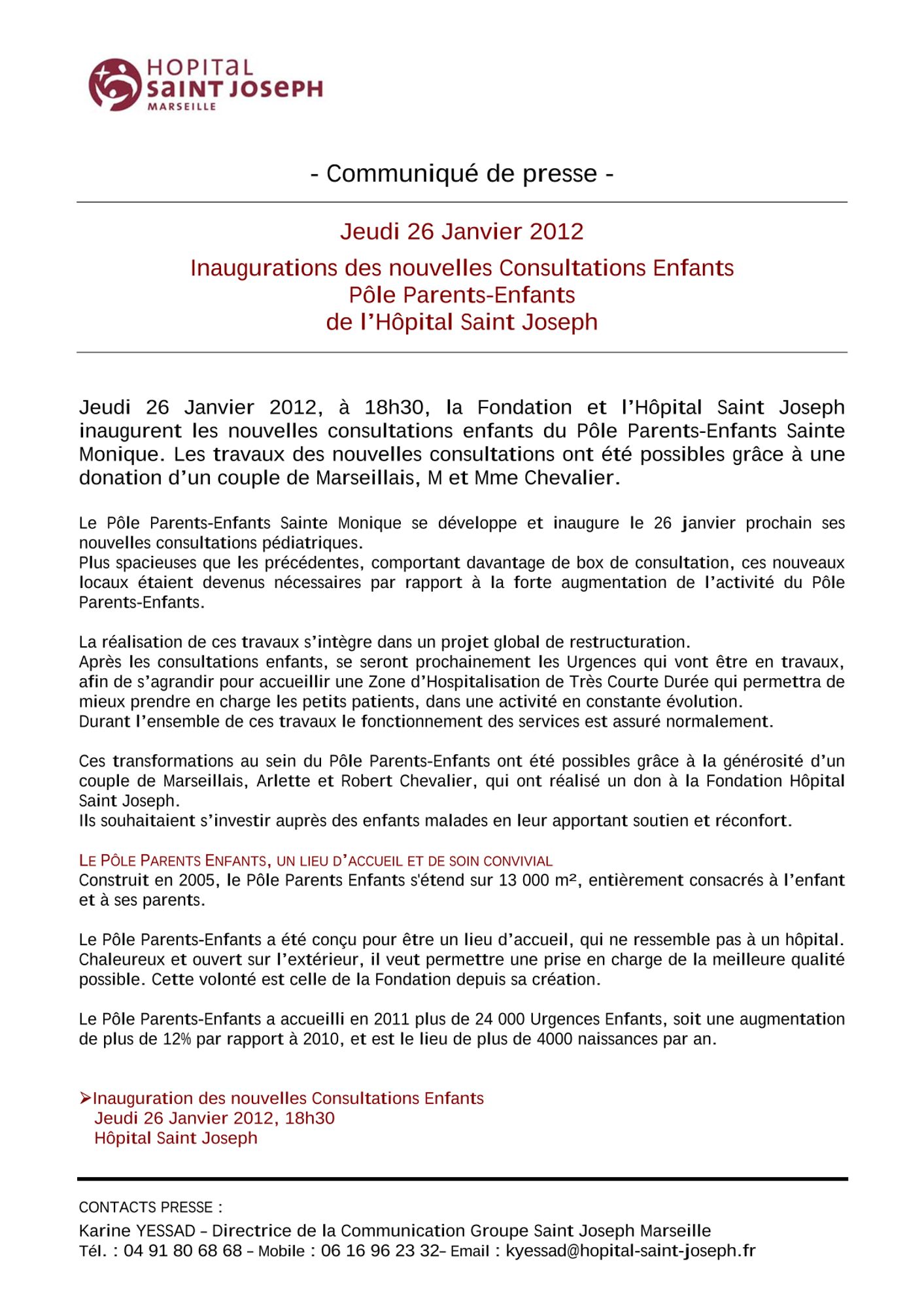Inauguration des nouvelles Consultations Enfants Pôle Parents-Enfants de l’Hôpital Saint Joseph - Jeudi 12 janvier 2012 :